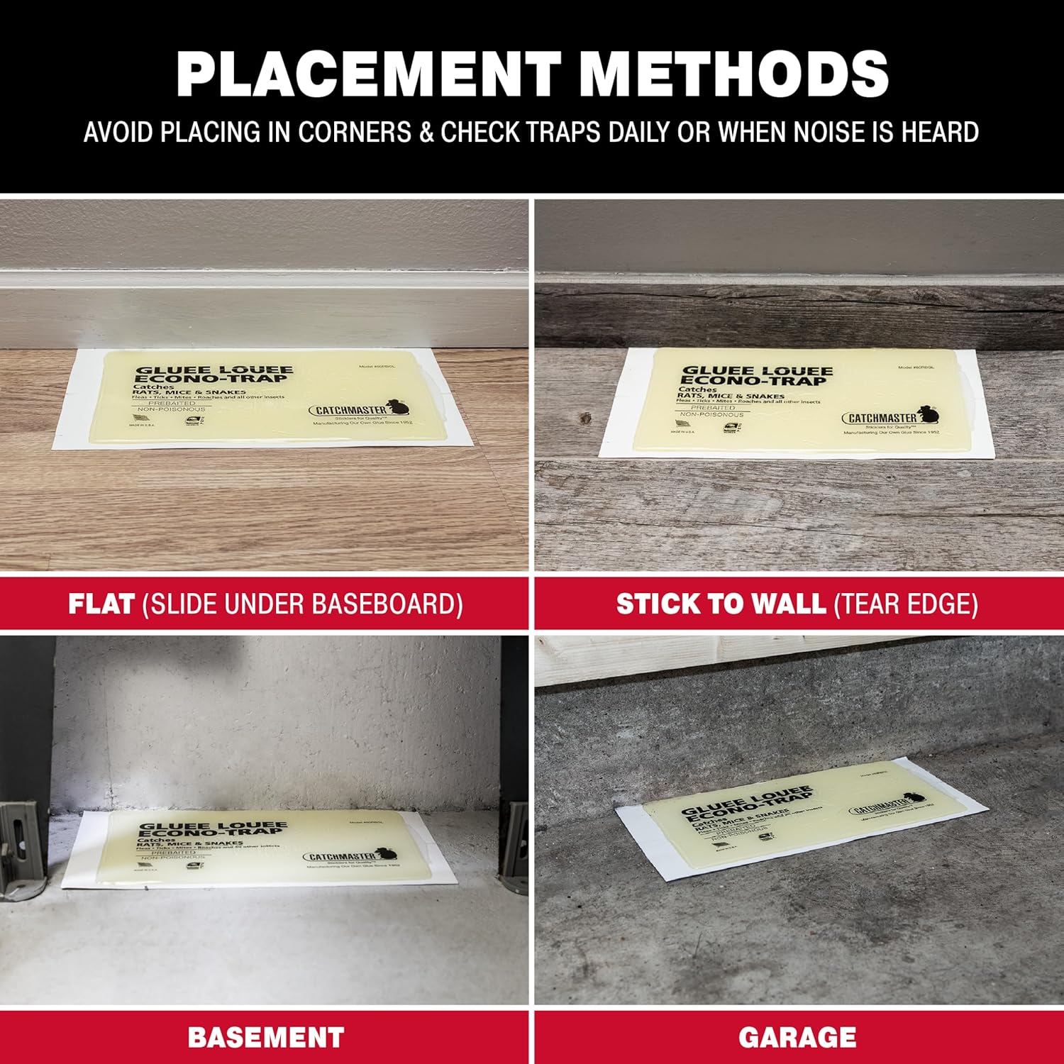 - YEAR-ROUND CONTROL: Catchmaster glue traps for mice and rats are pesticide-free and mess-free. The mouse and rat trap is an effective and easy solution for insect and rodent problems. When placed in an area with normal conditions, rodent and spider traps for inside your home can last up to one full year.