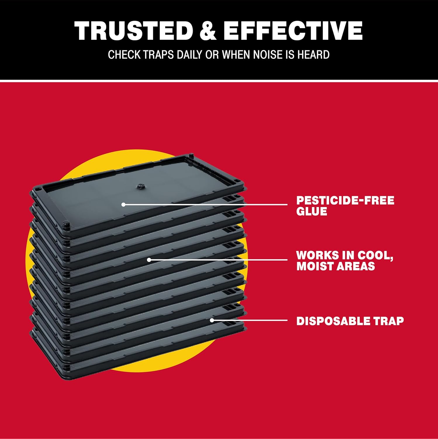 - YEAR-ROUND PROTECTION: The disposable large mouse pad is ready to use. Our adhesive formula is designed to prevent hardening that can limit the effectiveness of the rodent and snake trap. When placed in an area with normal conditions, glue mice traps can last up to one full year. The glue trays are ideal for wet/damp/humid conditions with a waterproof design.