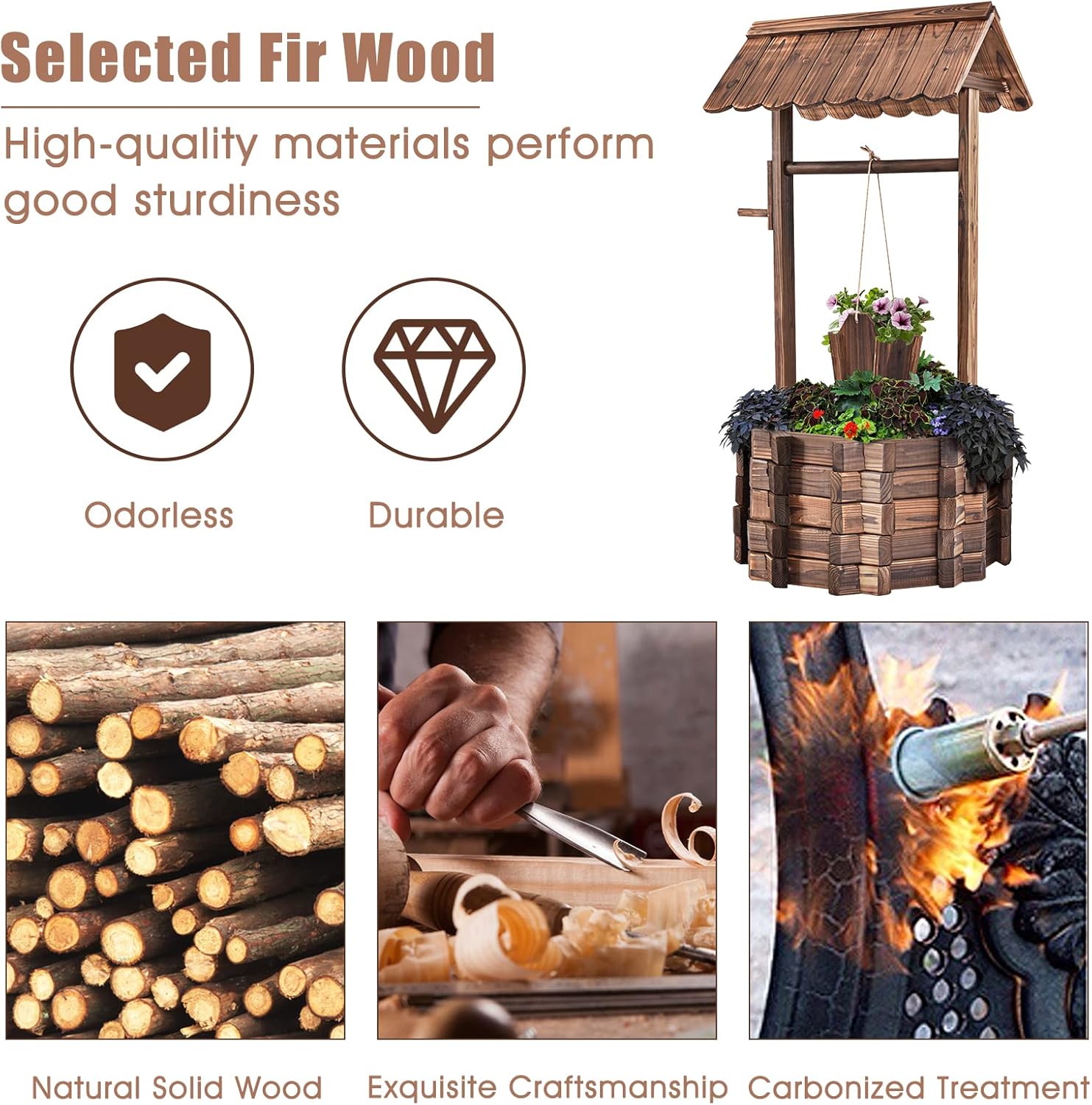 - Special Feature : Rustic Wooden Wishing Well Planter with Hanging Bucket and Roof