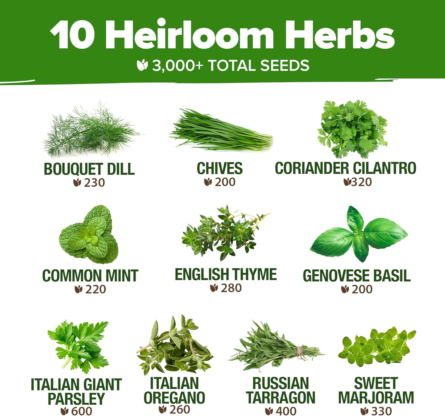 - High-Quality, Non-GMO & Heirloom Herb Seeds: This selection features 4,500+ seeds from 15 heirloom herb varieties that are completely non-GMO.These herb seeds are perfect for those seeking a sustainable, eco-conscious way to grow herbs indoors or in backyard garden beds. With high germination rates, they provide dependable results whether grown hydroponically or in soil. Ideal for those searching for the best herbs to grow indoors or outdoors with long-lasting yields season after season.