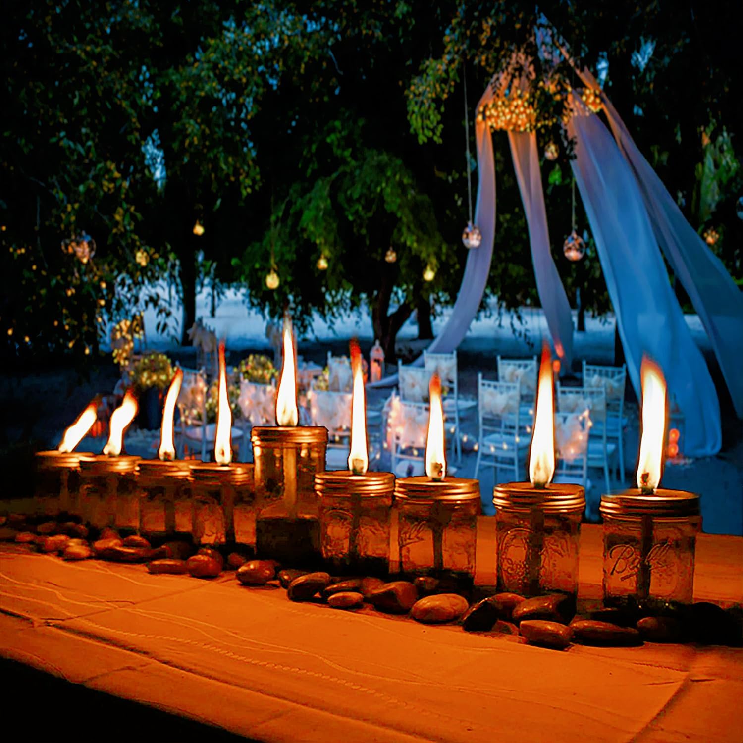 - Easy to Operate:This mason jar table torch kit Included 4 fiberglass torch wicks,4 mason jar black lids,4 caps with chain,4 protect tubes, just add your own [REGULAR MOUTH] mason jars.