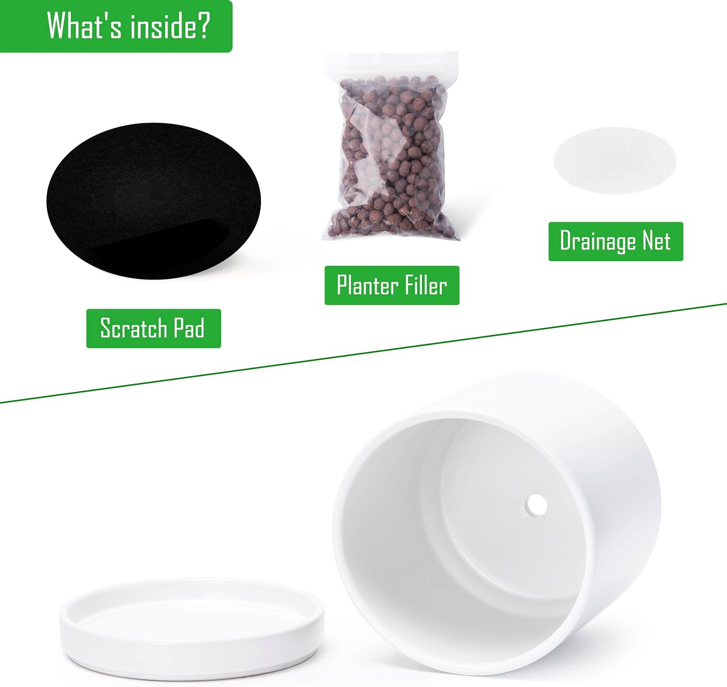 - Planter pot with drainage hole, mesh drainage net and protective scratch pad included.