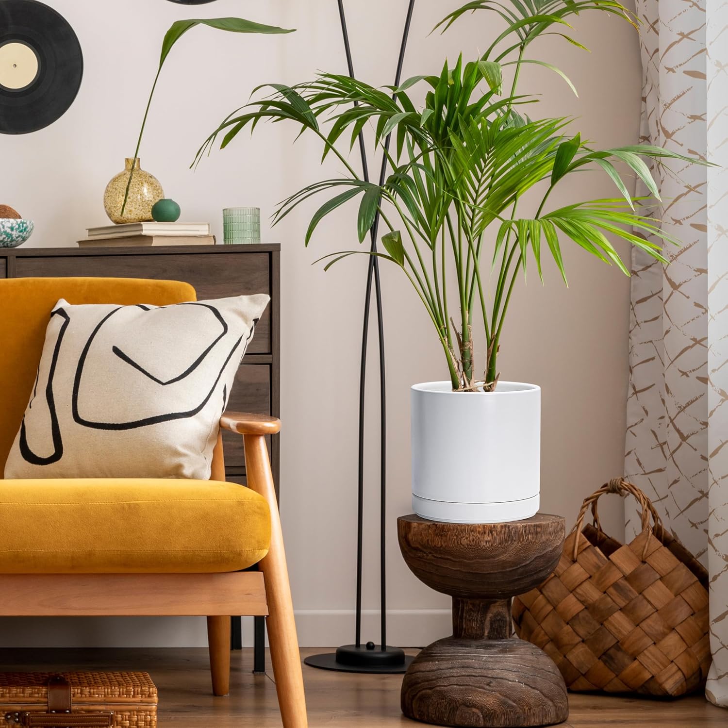 - Simple, elegant, and modern cylindrical straight round planter pot with saucer and drainage hole.