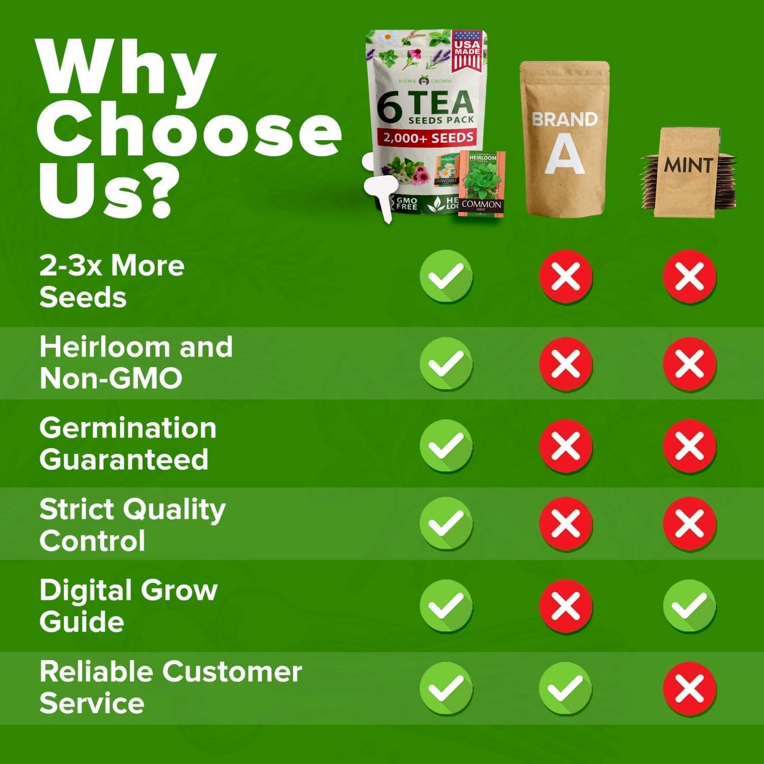 - 6 VARIETIES of Herbal Tea Seeds - Has everything you need to grow your very own tea garden. Make the freshest herbal teas straight from your own garden with these seeds: German Chamomile, Vera Lavender, Common Mint, Lemon Balm, Peppermint, Purple Coneflower Echinacea