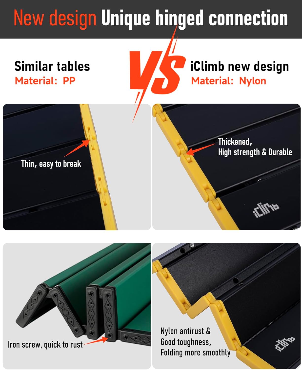 - Unlike other similar tables with bungee cord connection, this table has unique hinged design connection which will make it last many years.