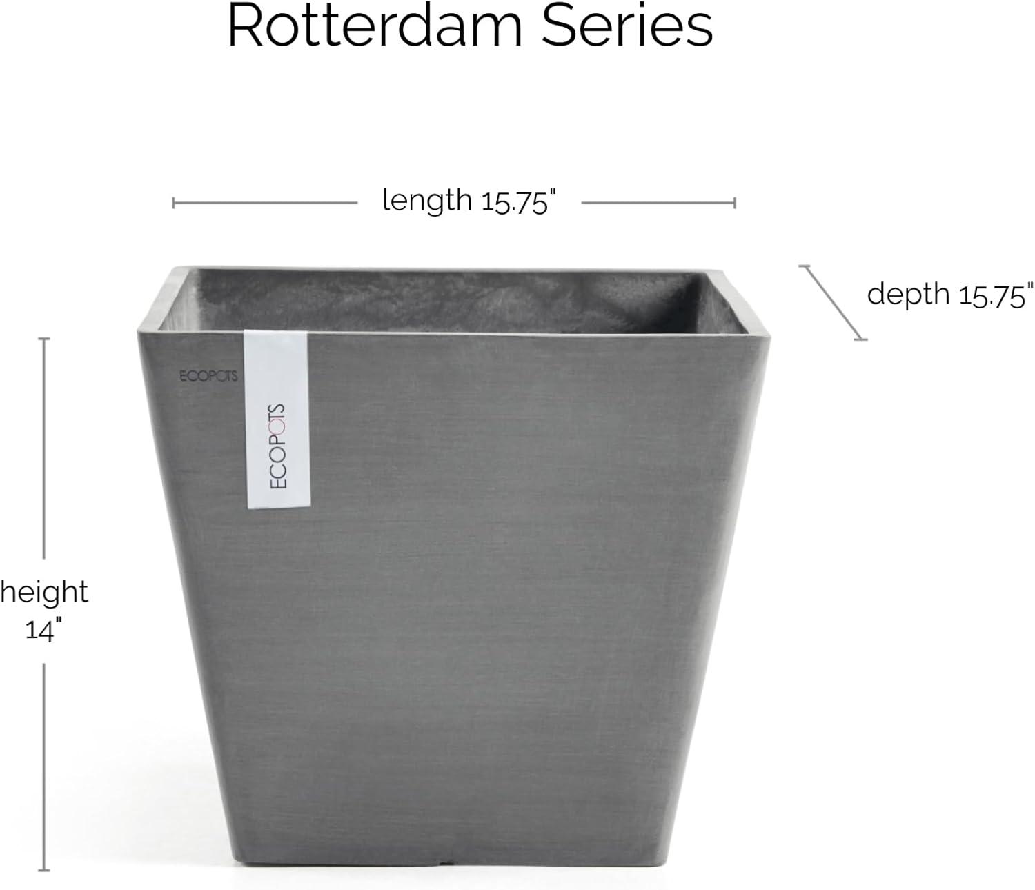 Ecopots Rotterdam Durable Modern Square Indoor/Outdoor Recycled-Based Composite Flower Planter, Grey, 15.75"