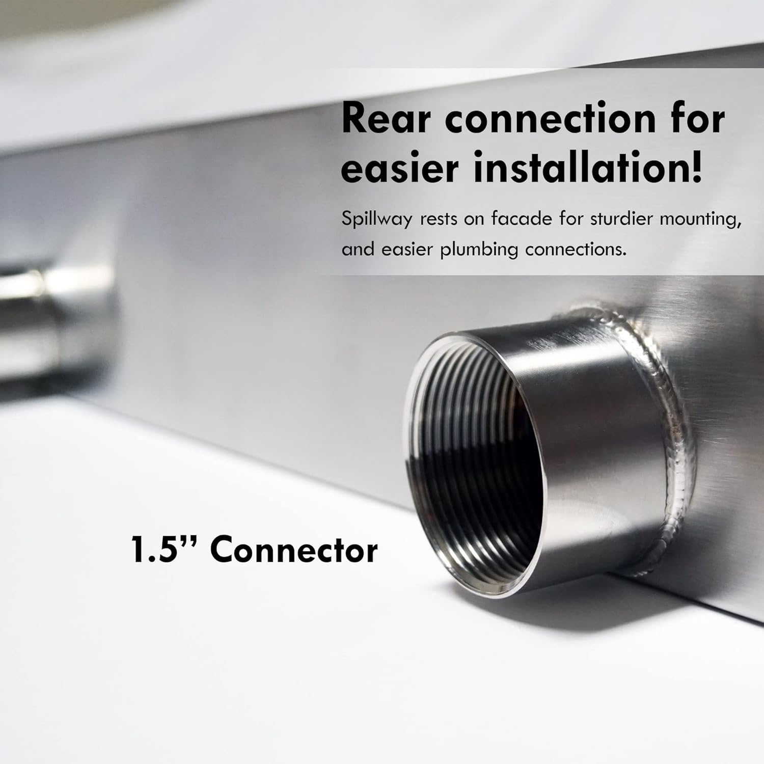 - Water inlet is Three (3) 1.5" Female Thread Located on spillway back. We recommend 1000 GPH per foot of spillway length for proper flow