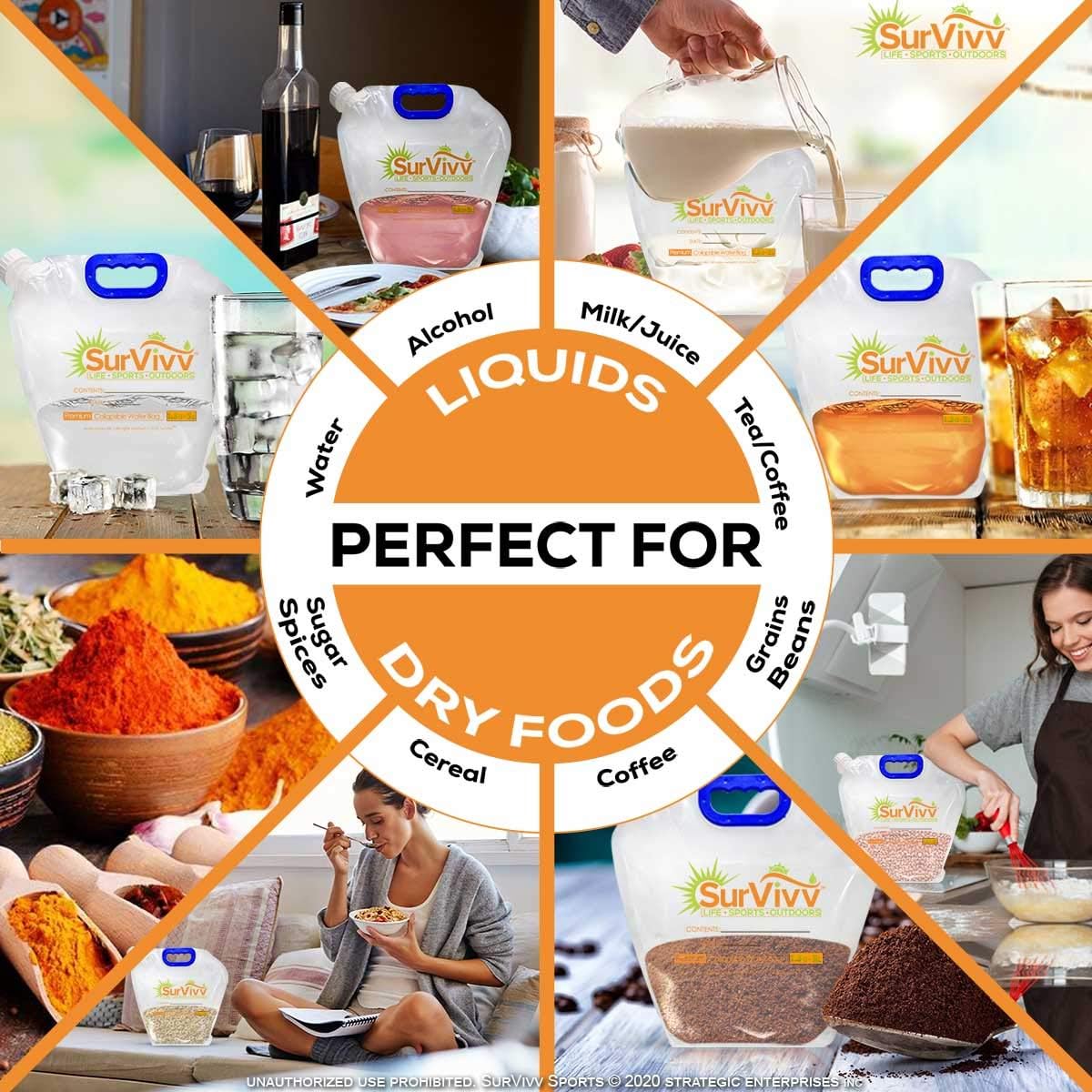 - FREEZABLE & MULTIPURPOSE Freezer safe (great ice bag). Great for camping, hiking, backpack, fishing, sport events, parties. Great for survival & emergency kits. Store water, milk, tea, juice, alcoholic drinks etc. Also dry goods like beans, grains, coffee