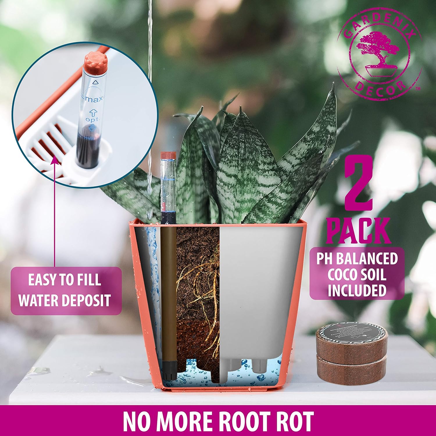 - At Gardenix Decor, We are here to help you keep your plants happy and thriving – even with a busy schedule. We’re plant people who know the joy and beauty plants bring to a home. We’ve designed our planters to function efficiently and self-sufficiently, to take care of your plant even when you can´t. If you aren’t completely satisfied with your self watering pots for indoor plants and outdoor plants, simply reach out to us directly so we can make it right.