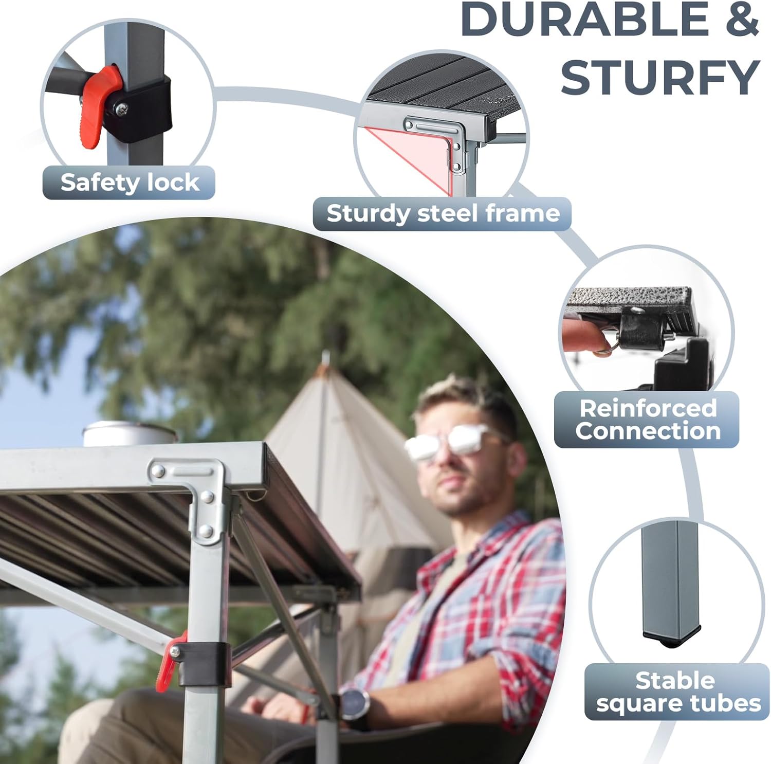 - 【Durable Aluminum Camping Table】This folding table camping is made of thicker aluminum alloy and anodized treatment, which is rust free, corrosion-resistant,easy to clean. The aluminum grill table adopts metal material contact point and triangular steel structure design to ensure stable use.