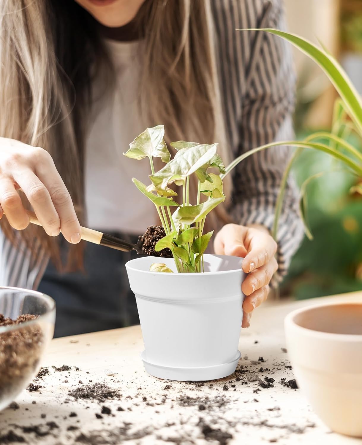 - 【Size of Planter Pots】Each plastic pot is 6 Inch in Opening Diameter, 4 Inch in Bottom Diameter, 5 Inch in Height. With a tray, these white planters are the best choice for growing indoor and outdoor small to medium-sized home/office plants.