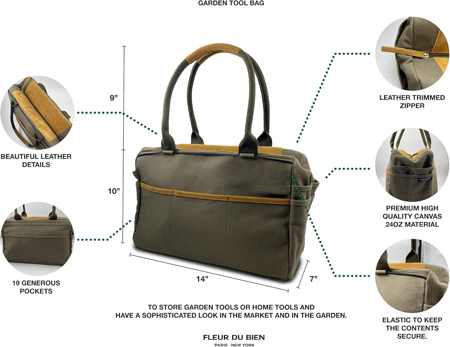 - KEEP EVERYTHING ORGANIZED: the quality tool bag has 19 pockets and a 24oz large capacity, our gardening canvas tote bag gives you all the space you need to keep your tools organized. It’s made using durable canvas material that’s both dirt and water resistant. Also Tool bag leather
