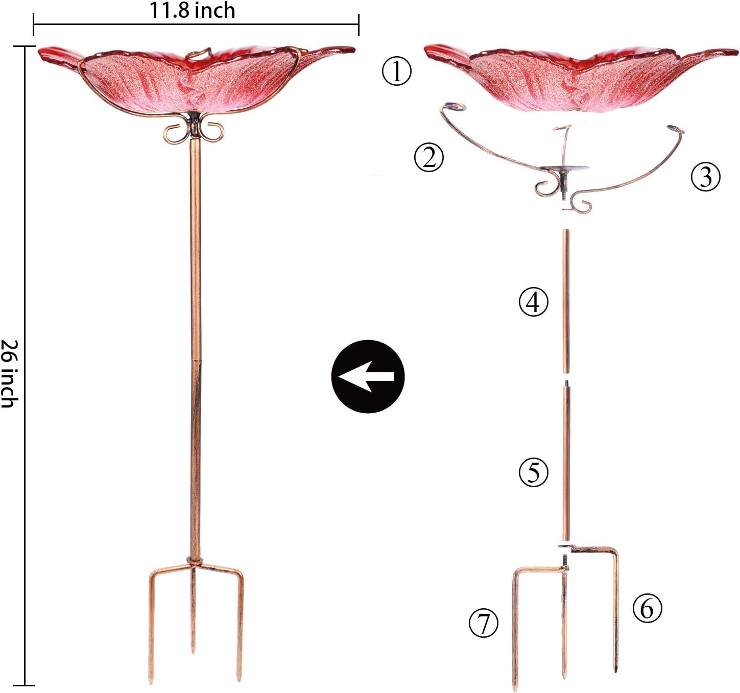 - Bird bath is designed with handmade glass with beautiful color and metal stake base is three-pronged bottom,adding its stability