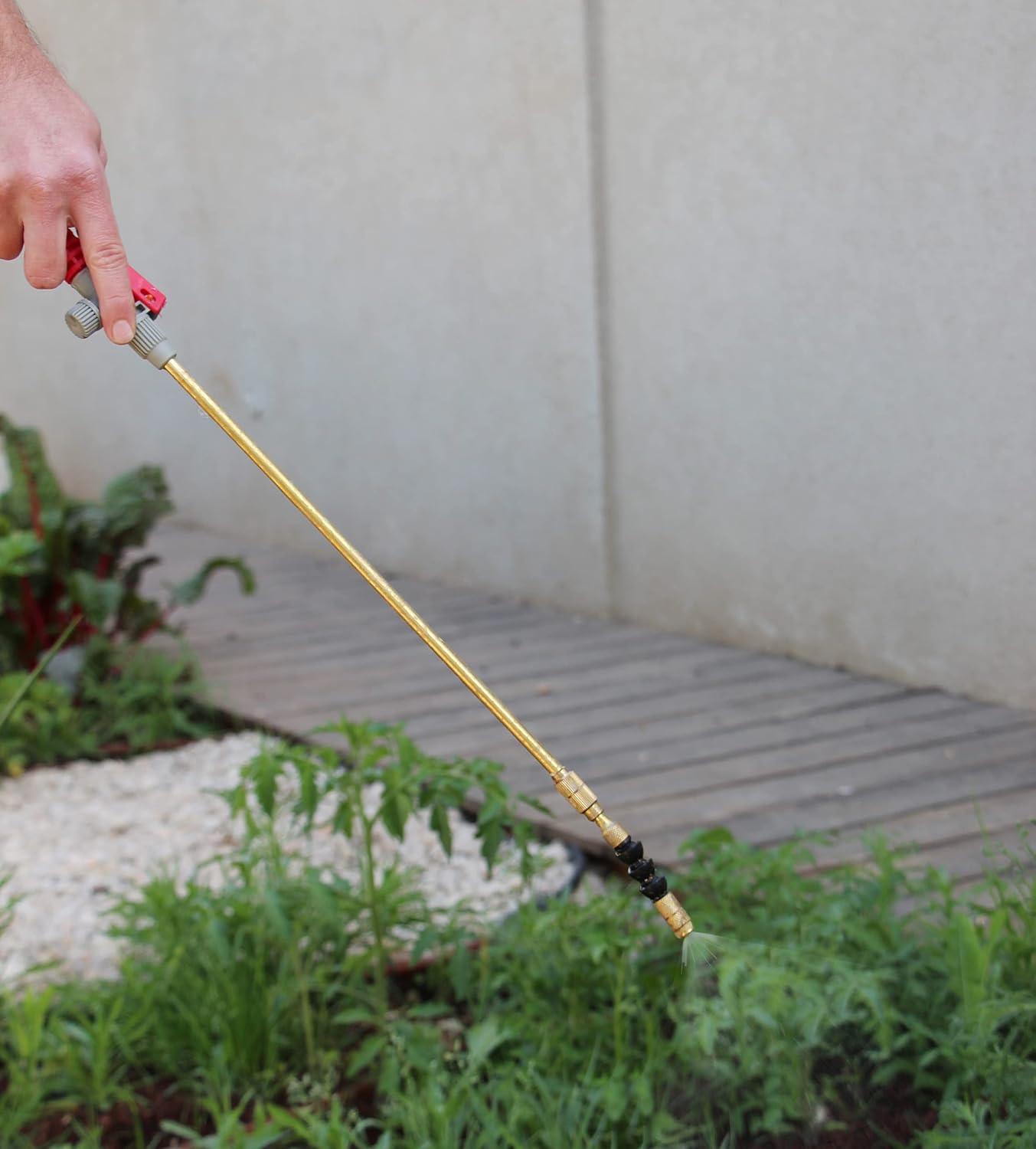 - TELESCOPIC EXTENDABLE SPRAYING WAND: Enjoy a better reach and work standing up straight with the help of the adjustable brass sprayer wand (total length including handle 23 1/2"- 34 1/2"). The comfort-grip handle has a locking trigger, so you can rest your hand while keeping a constant continuous flow. At the tip, you can adjust the water spray intensity by rotating the nozzle from water mist to water jet. The 1 1/2" rubber part at the tip allows for 360Β° flexing for extra angling options.