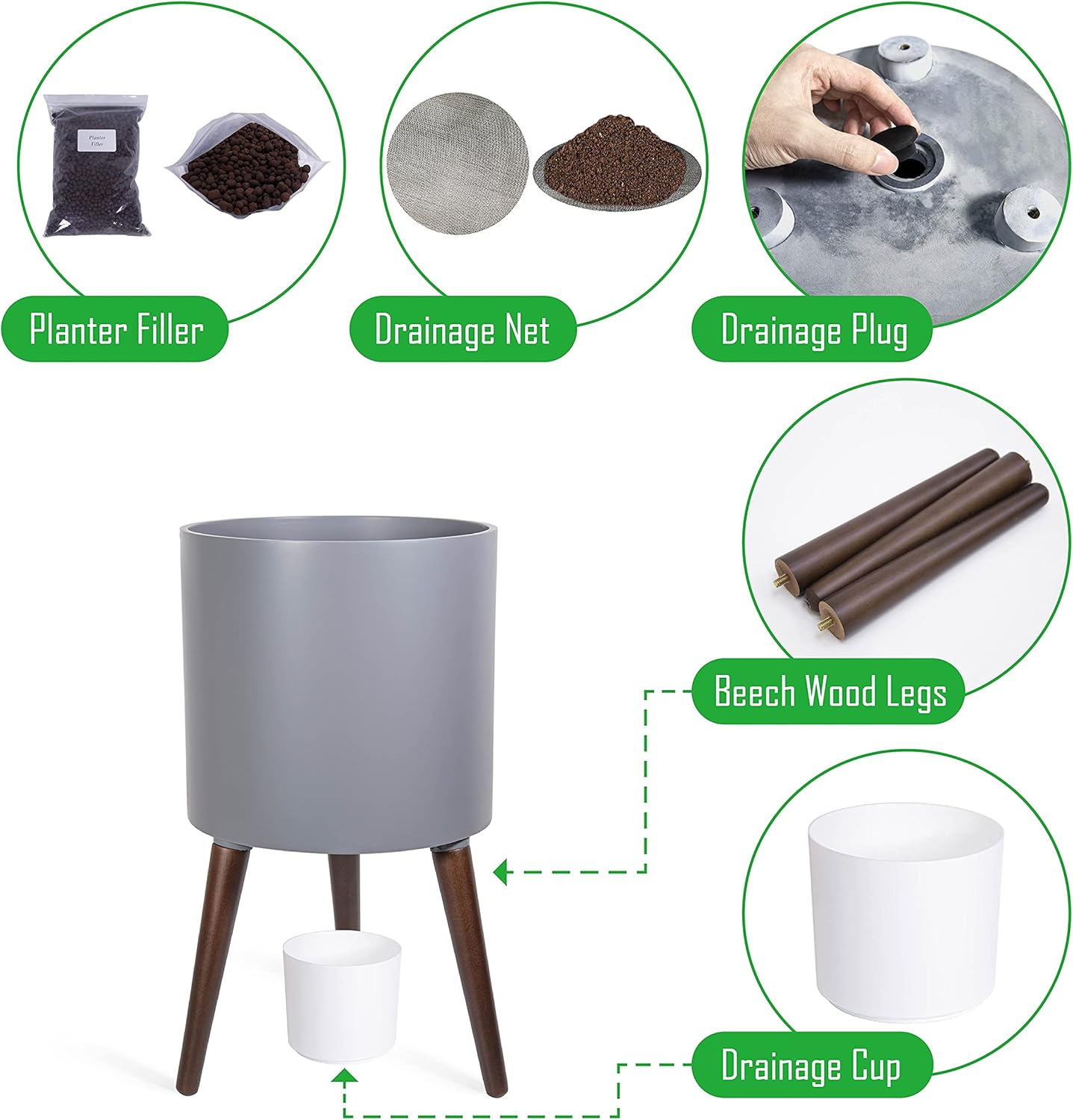 - Whatβs included: planter pot with drainage hole, set of stand β 3 solid wooden legs.