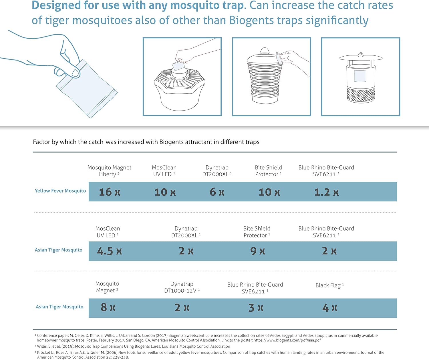 - PACKAGE CONTENTS: This contains SIX packs of BG-Sweetscent attractant, for use in the BG-Mosquitaire, BG-Home, and other commercial traps. One pack is required per trap. For best performance use with Biogents traps.