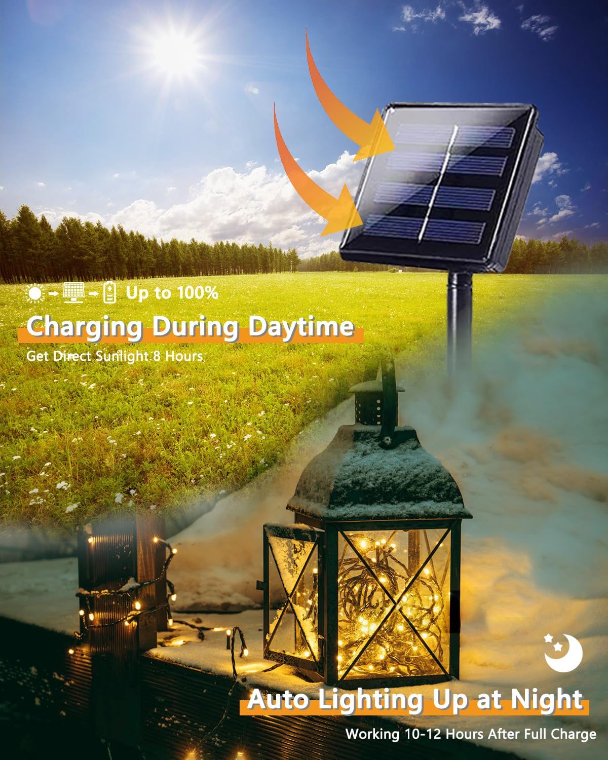 - [Longer Working Time & Biger Solar Panel/Batterys]: This solar string lights outdoor waterproof has updated to 1800mAh with superior quality and Biger solar panel. No extra electric cost, solar powered only, and it can work 10-12 hours after fully charged. This solar outdoor lights with auto sensor control, Auto on at dark and Auto off at daytime.