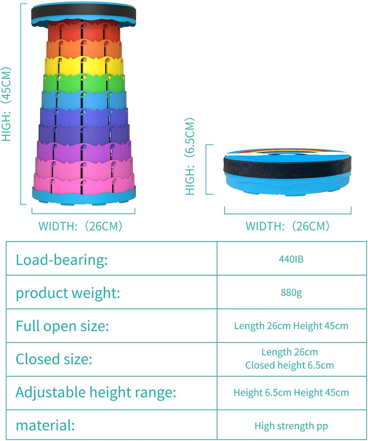 - ăSafety and Stabilityă Retractable stool is made of high-strength heavy duty environmental friendly material plastic PP, the cylinder shape structure, tight connecting clasps, and the non-slip base ensure the stability of collapsible stool, provide safe and comfortable seat. The maximum load capacity is as much as 440lbs!