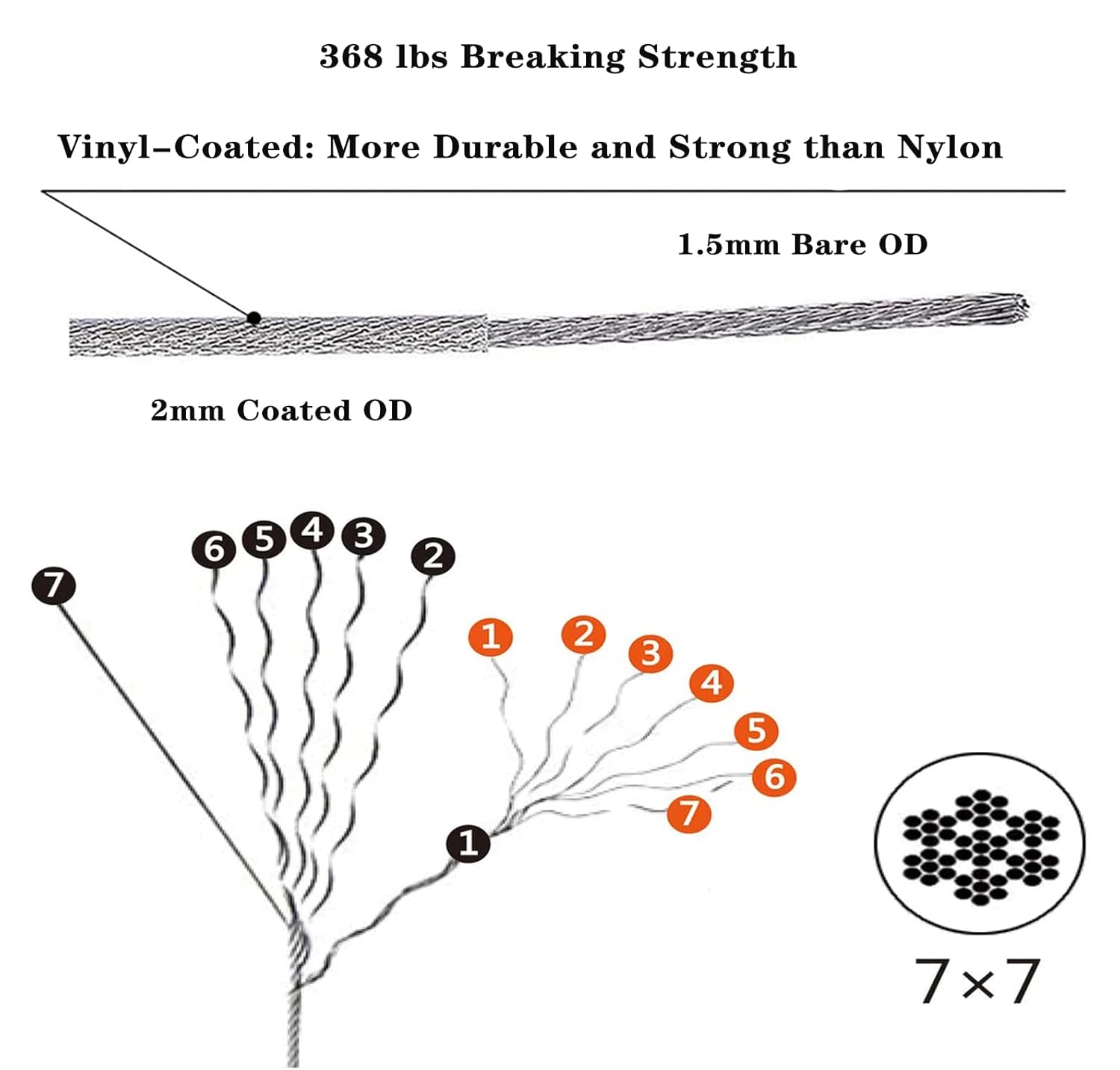 - 【High-strength Vinyl Coated Aircraft Cable】:The stainless steel cable bare OD is 1.5mm, coated OD is 2mm, with 7X7 construction, that you can easily trimmed to any desired length. Once the cable is pulled tightly, it is sturdy enough to hang the heavy string light in a large open area without sagging.