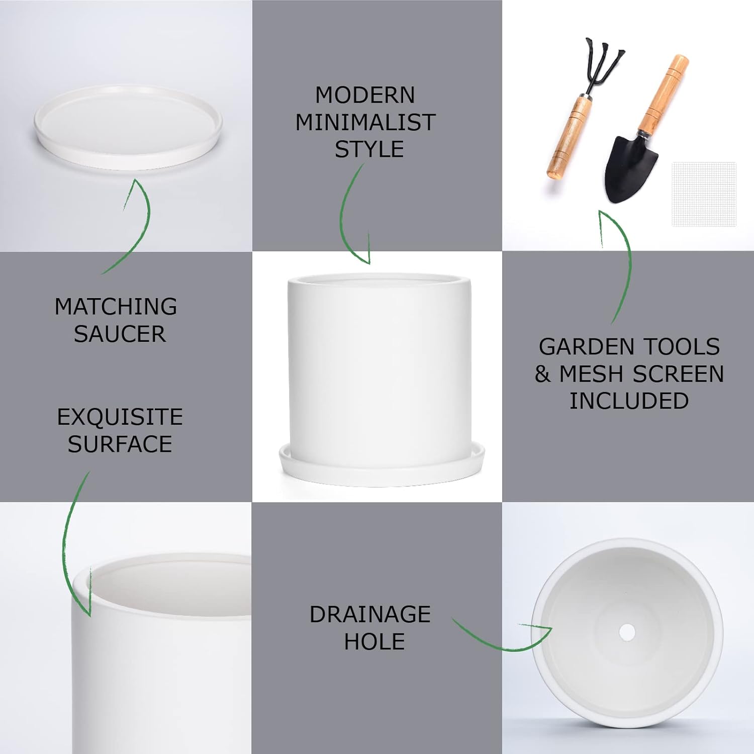 Plant Pots 10 Inch Ceramic Planter with Drainage Hole and Saucer, Matte White Modern Cylinder Planter Pot for Indoor Outdoor Plants Flowers, Full Glazed Finish