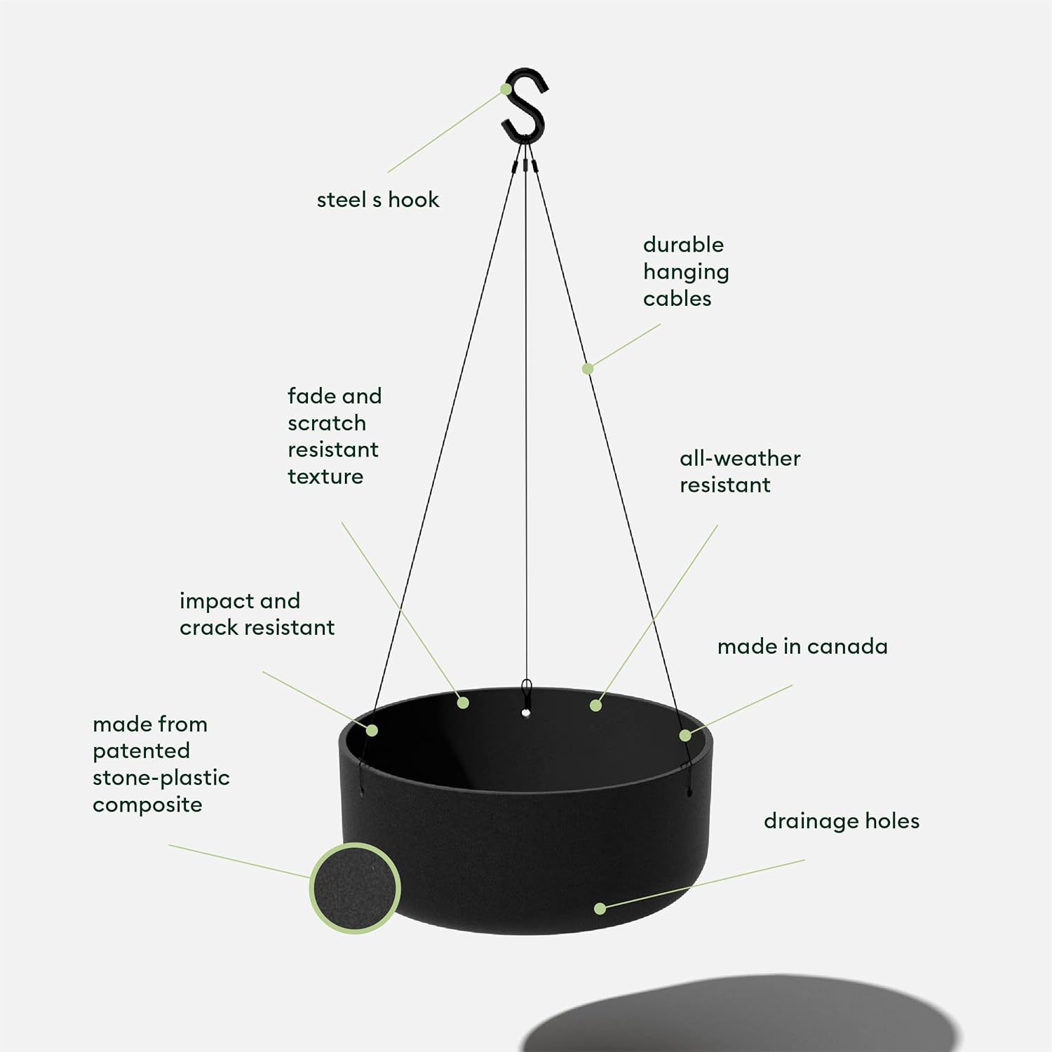 • DURABLE MATERIAL: Made from a plastic-stone composite, the Hanging Kona Bowl planter has a subtle textured finish and is all-weather resistant to cracks, scratches, UV and fading; perfect for hot or cold climates ranging from -20 to +120 degrees
