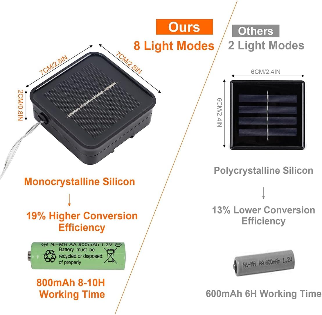- 8 Lighting Modes with Memory Function: Our solar string lights have 8 lighting modes for you to choose: combination, in waves, sequential, slo glo, chasing/flash, slow fade, twinkle/flash, and steady on. Comes with memory function, remember last setting automatically after turn off the power, no need to reset again