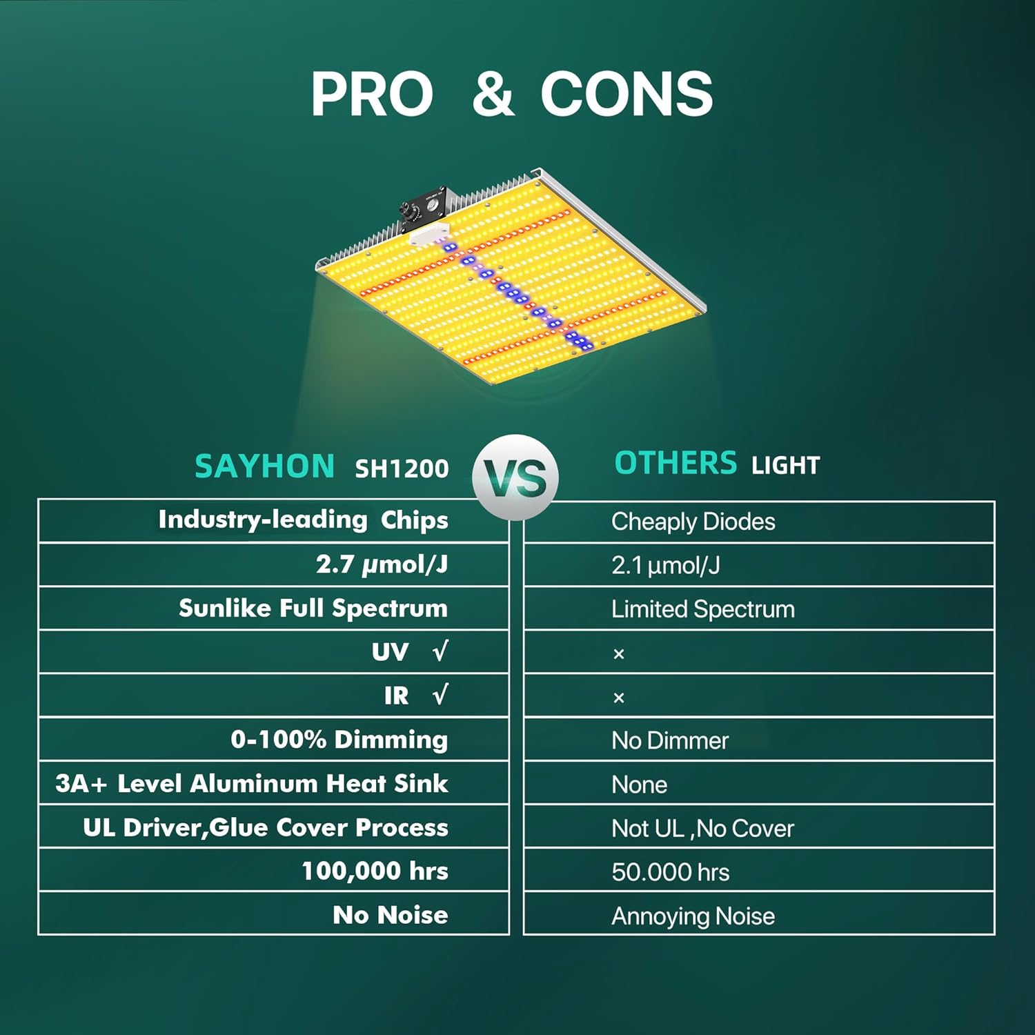 - ๐ฟ Ideal Cooling System: Full coverage 3A+ level aluminum heat sink can lower temperatures 50ยฐF greater than other brands, Sayhon led grow light maintain brightness at 95%+ after 3 years of use.