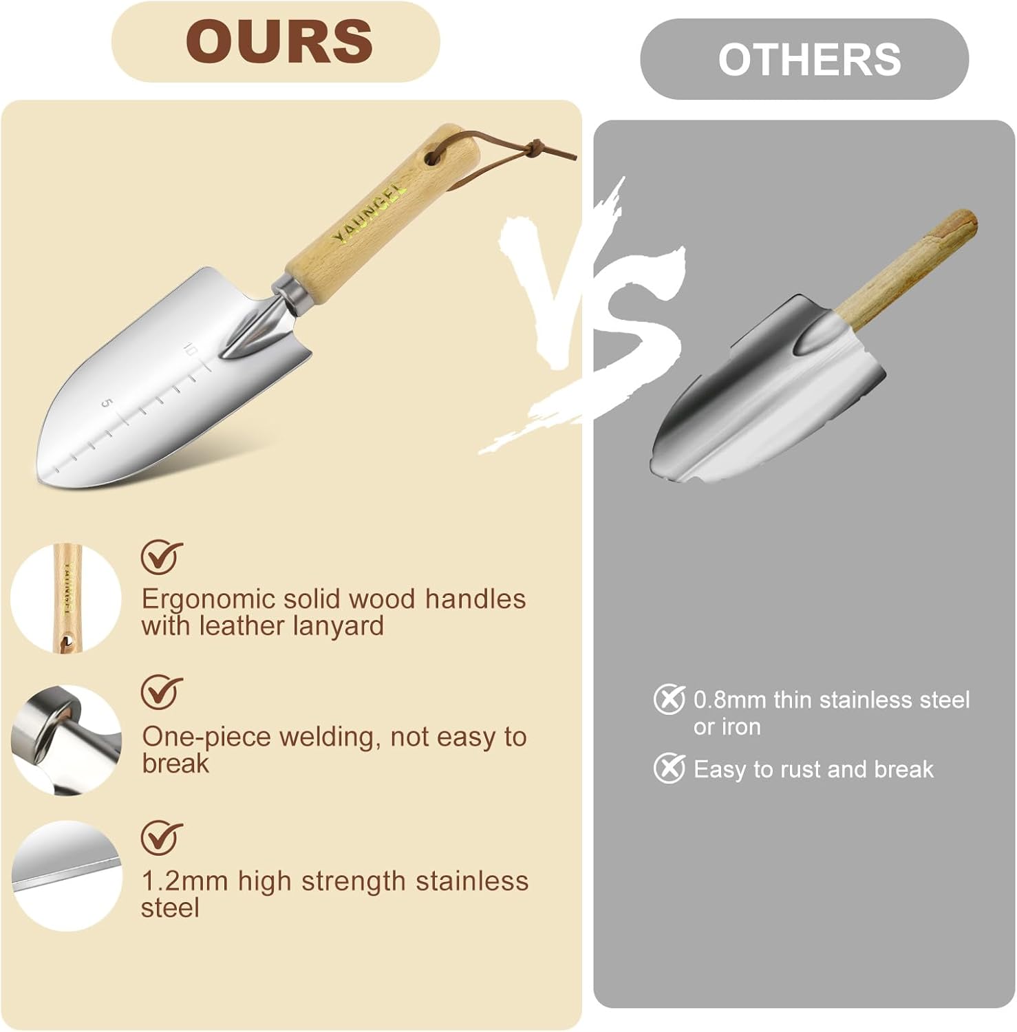 - Comfortable Handle - The gardening kit handle made of ash wood fits easily in your hand and will reduce hand pain and fatigue while digging, weeding, and planting. Handle bottom designed with cowhide lanyard for easy storage.