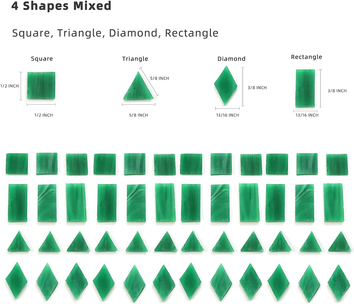 - 4 shapes mixed in each package - These mosaic pieces come with Square, Rectangle, Diamond and Triangle. Having all these precut beautiful shapes will not only save you a tremendous amount of time, but will also inspire you when trying to create new designs