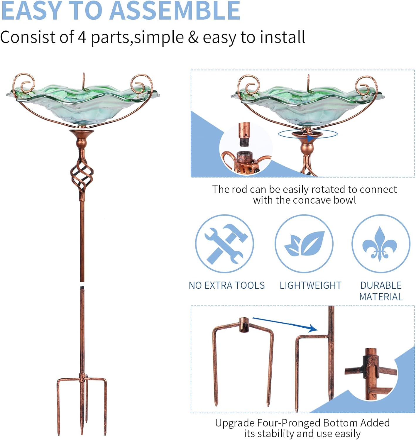 VCUTEKA Bird Bath Glass Outdoor Birdbaths Garden Yard Decor Bird Feeder with Metal Stake Green