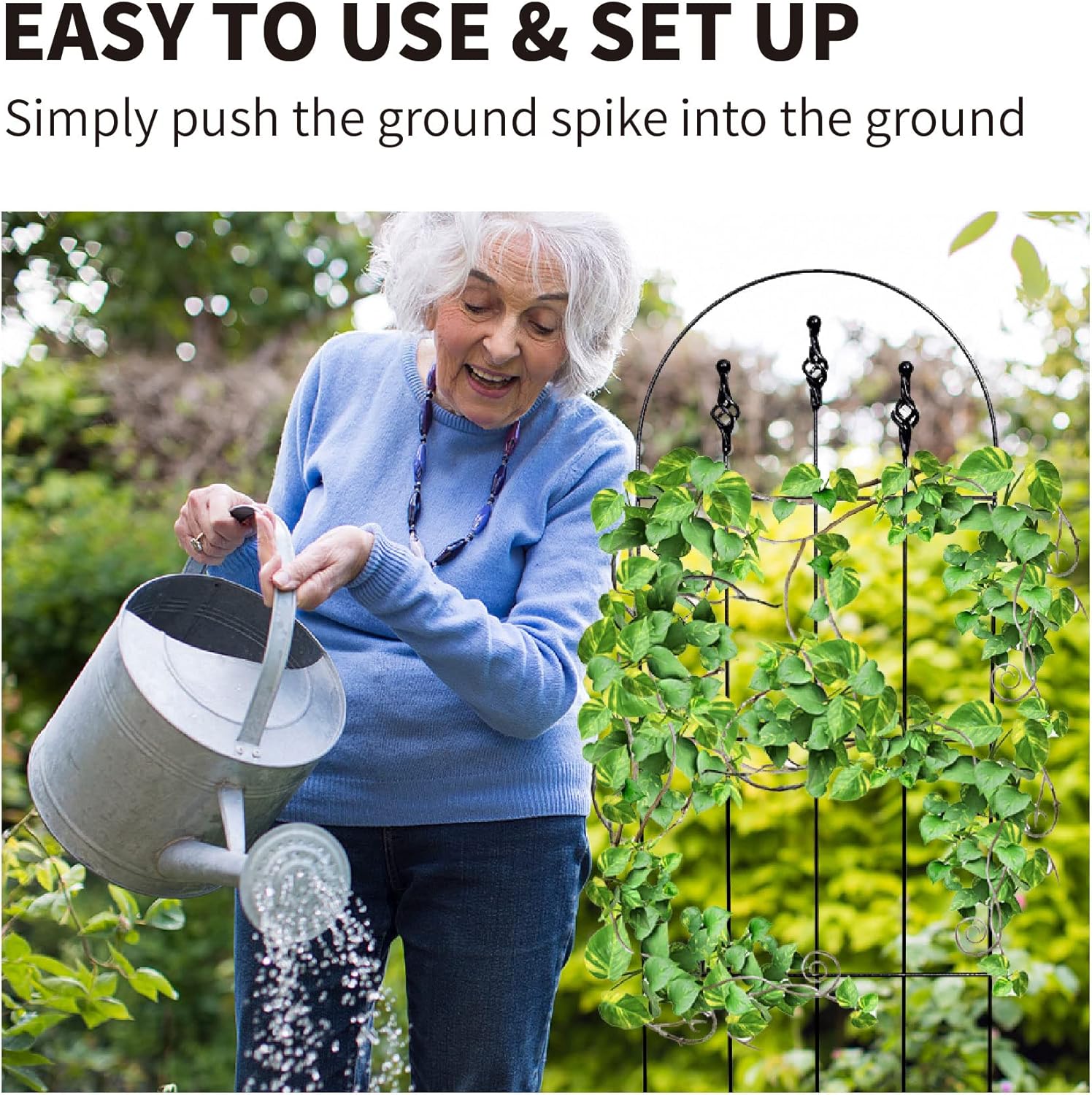 - [Sturdy Stability Structure]: With heavy duty iron frame and powder coated welded material. 6 inch ground spike inserts into the ground and add stability to the trellises.