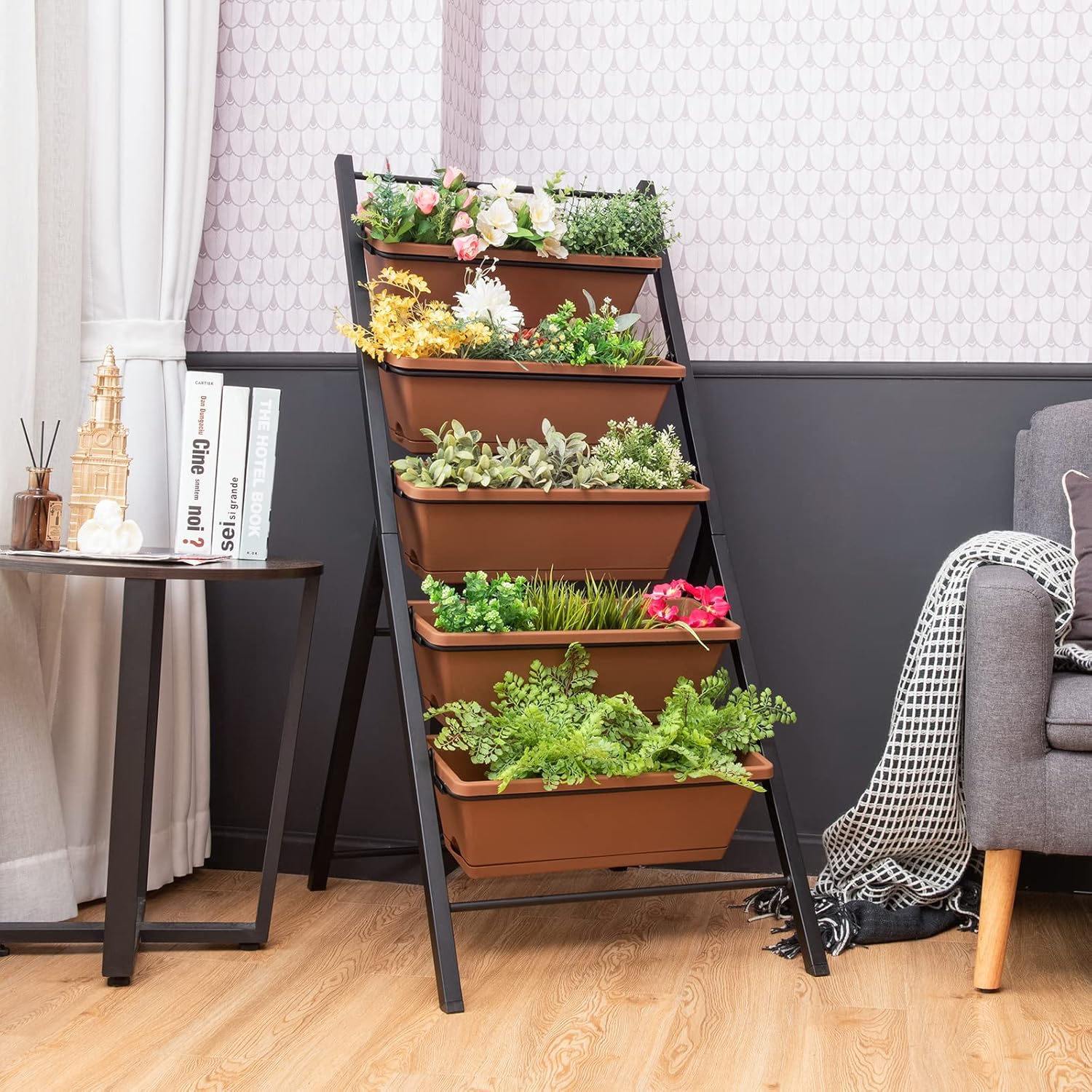 Giantex Set of 2 Vertical Planter Raised Bed, Elevated Garden Beds with Water Drainage Hole, Freestanding 5 Container Boxes for Herb Vegetables Flowers Growing, Outdoor Indoor Patio Balcony