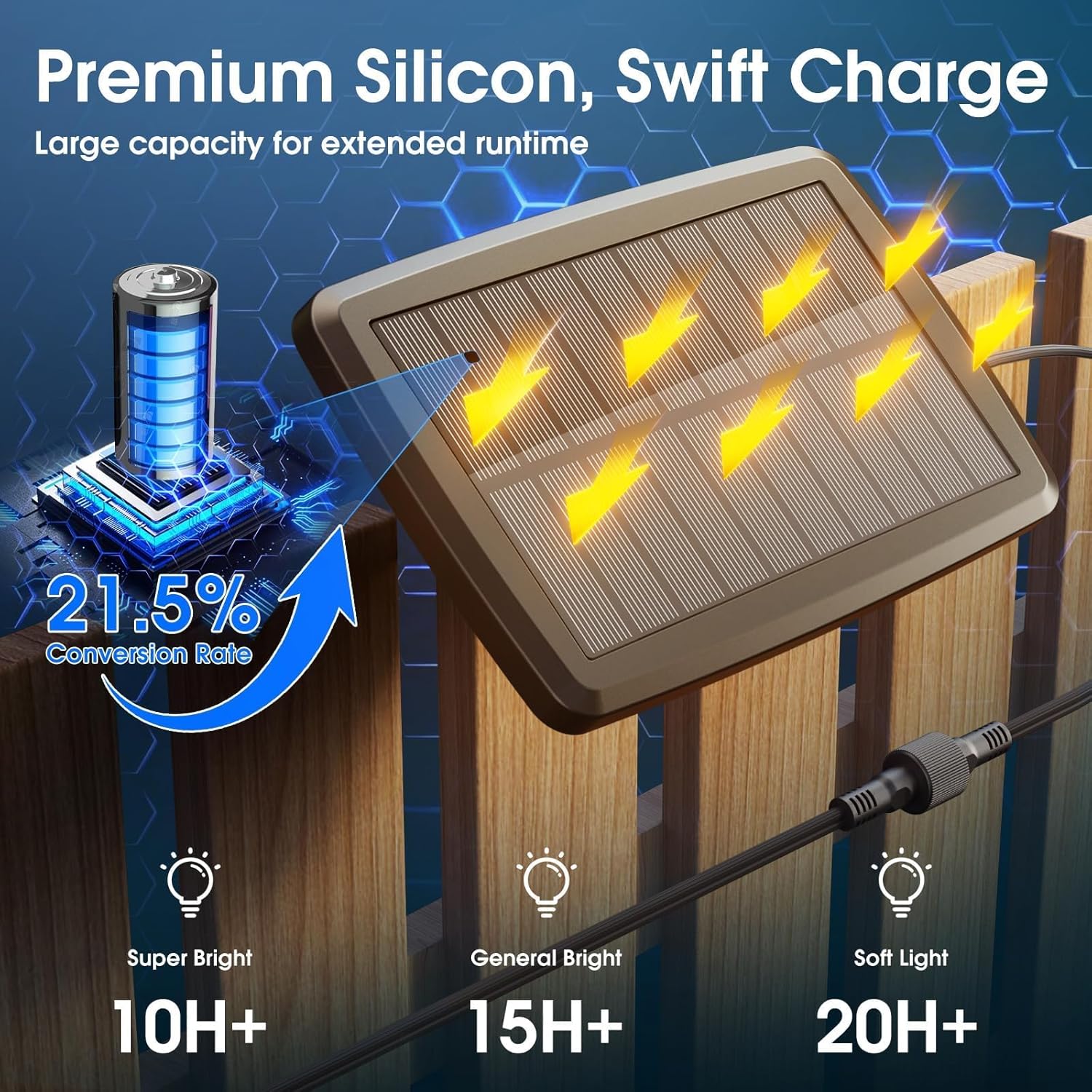 - A Single Charge to Last 5 Nights: The premium version of the high-performance battery can be used for a total of 20+ hours after a quick 8-hour full charge. The 7-hour automatic light-off function setting makes it last longer than other products. In continuous rainy days, it still has power to provide light for your yard.