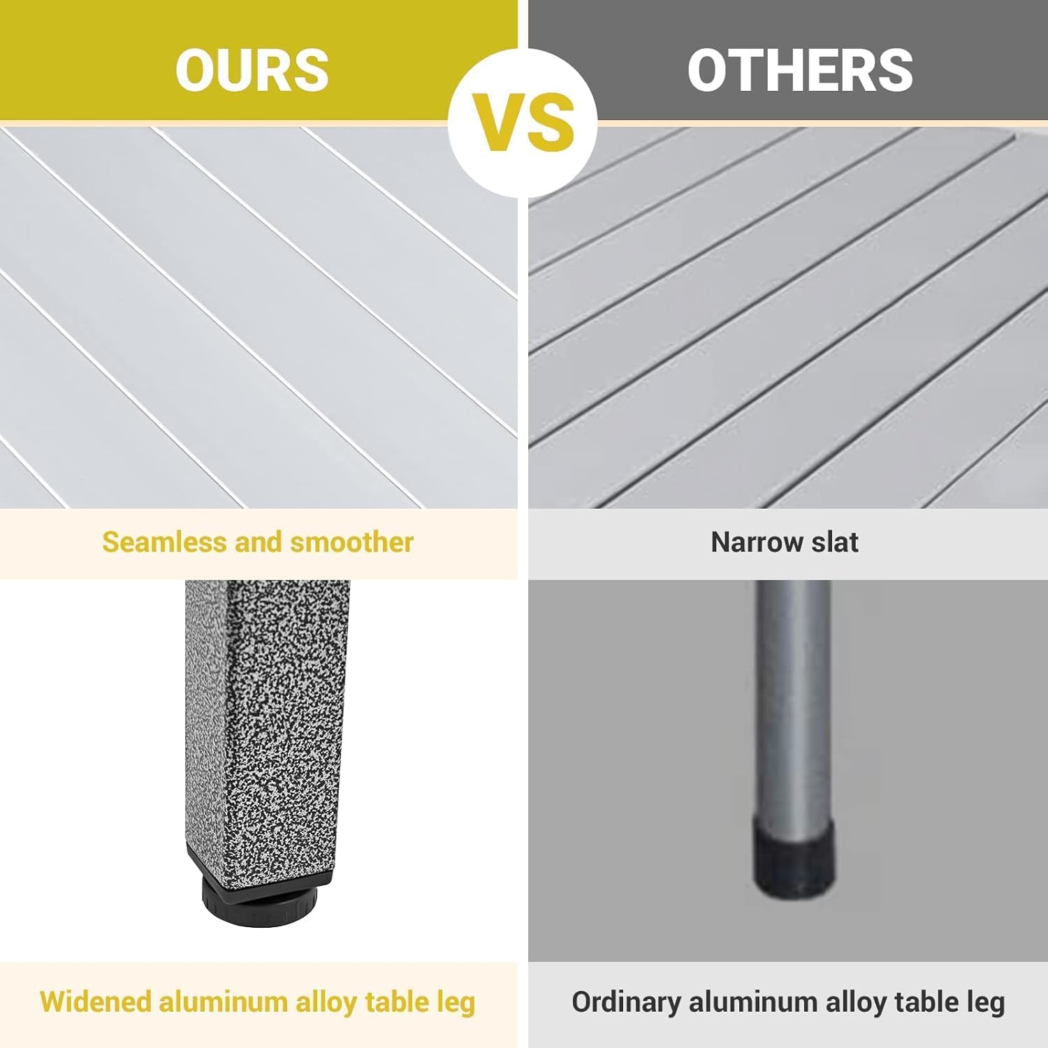 - 【Durable Roll Up Aluminum Camping Table】This folding camping table is constructed from thicker aluminum alloy with an anodized treatment, making it rust-free, corrosion-resistant, and easy to clean. The table top features a triangular steel structure design with metal material contact points, ensuring stable use even in rugged outdoor conditions.