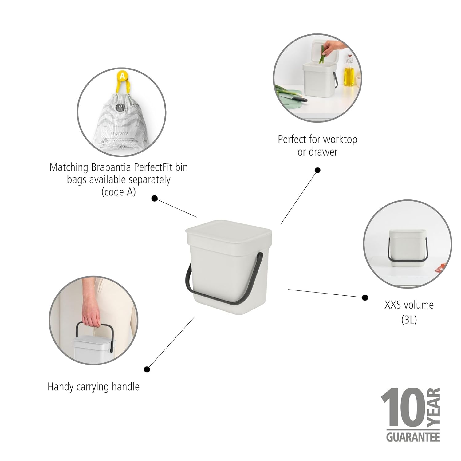 Brabantia Sort & Go Food Trash Can (0.8 Gal/Light Gray) Small Countertop Kitchen Compost Caddy with Handle & Removable Lid, Easy Clean