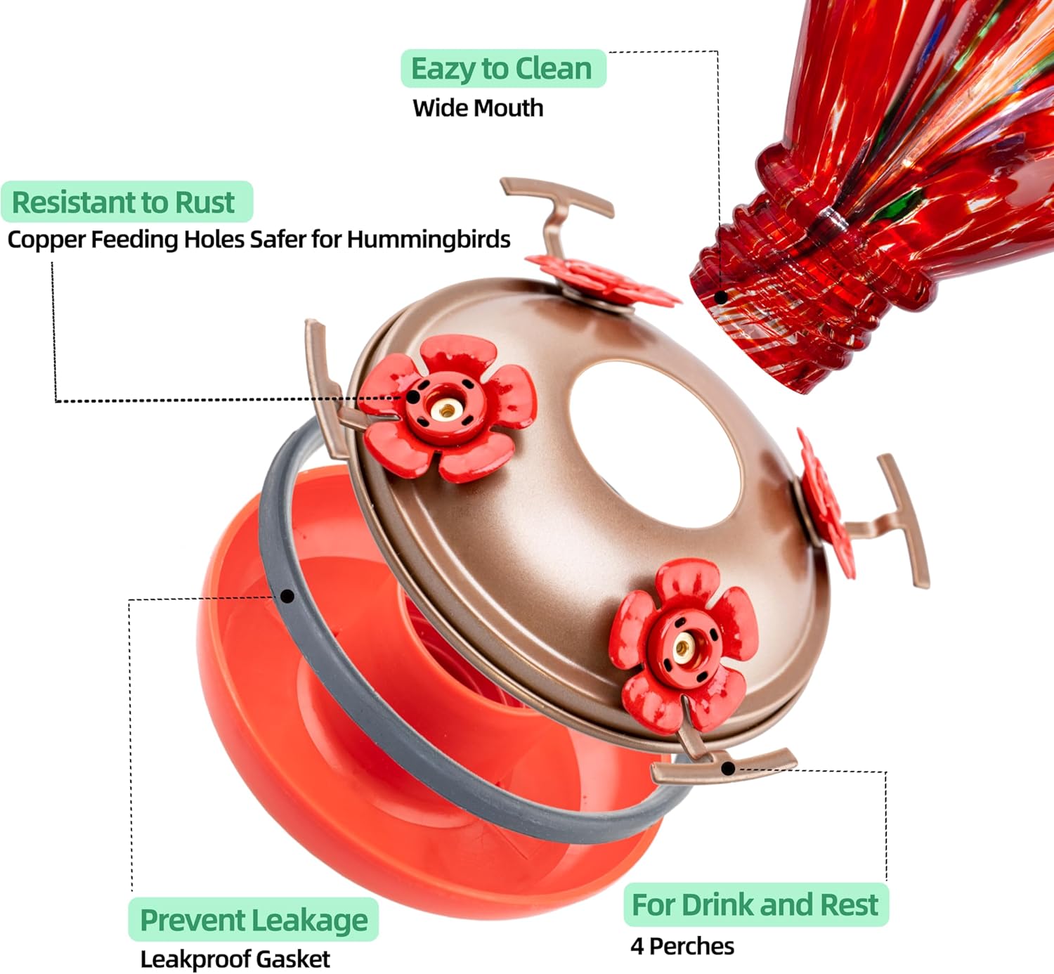 - 【Leakproof and SAFER Feeder Ports】The metal base is equipped with sealing ring and plastic basin for leakproof. UPGRADED feeder ports are made with premium copper materials, no sharp edges will cut or catch the hummingbirds' tongue. Make sure the gasket is securely attached before you hanging the hummingbird feeders outside.
