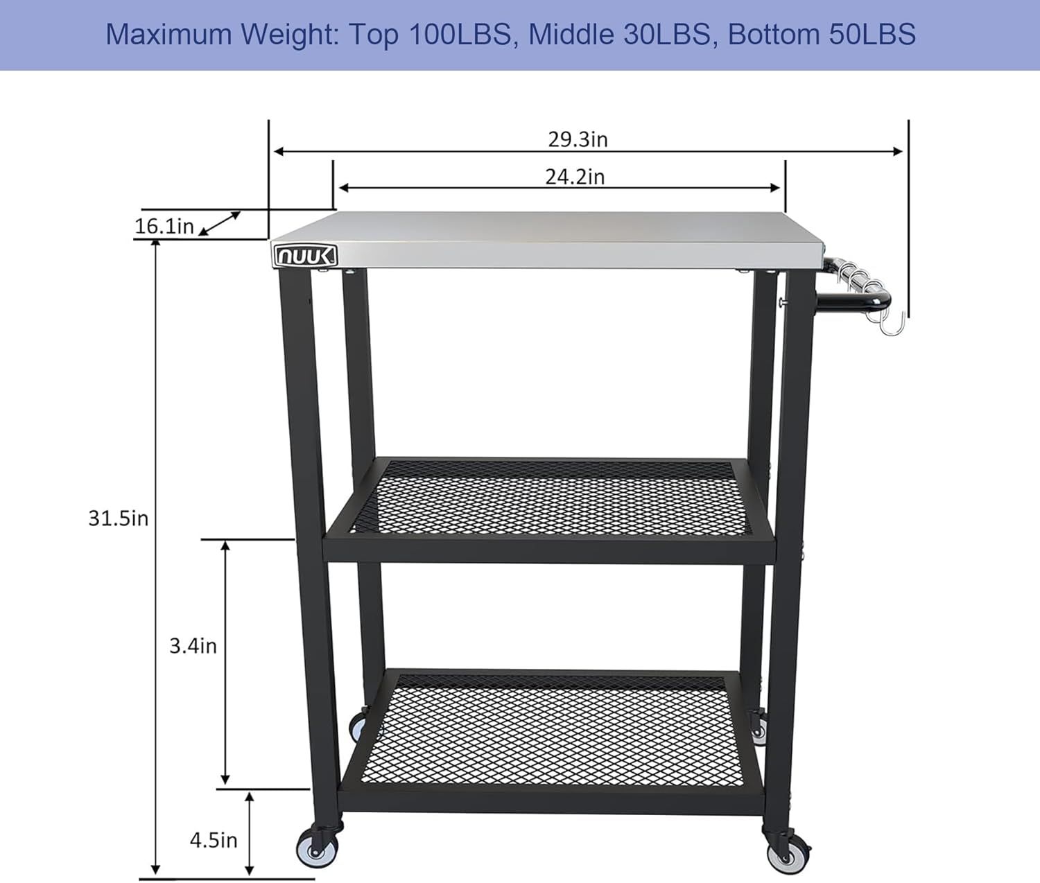 - 【Multifunctional Practical Design】The stainless steel dining table platform is composed of upper, middle, and lower parts, with sufficient space for storing all kinds of tableware, food, and condiments. It has four multifunctional S-shaped hooks and a firm side handle for hanging towels, tableware, and food