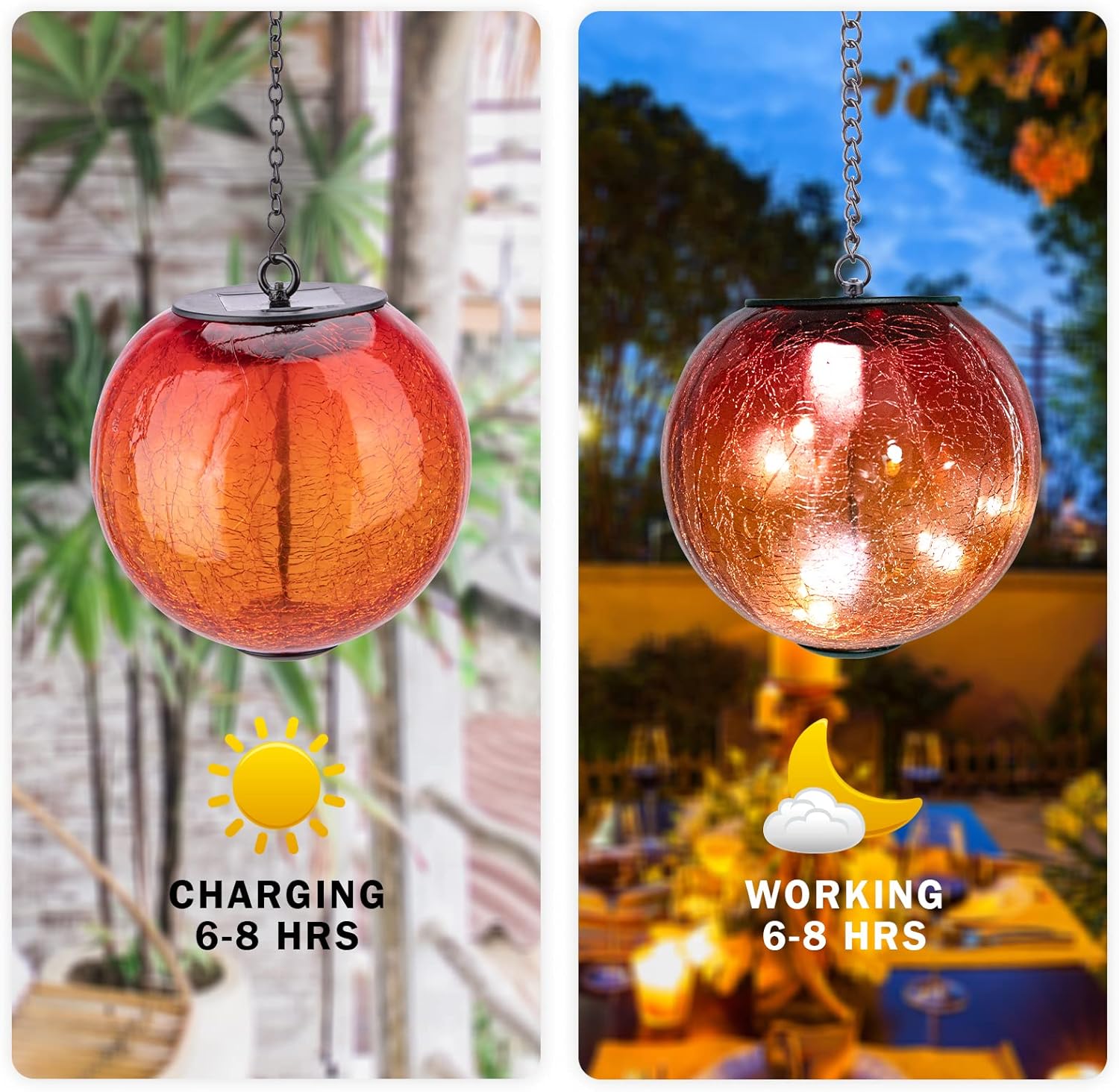 Hanging Solar Lights Outdoor Solar Lanterns Outdoor Decorative Cracked Glass Ball Lights Solar Powered Waterproof LED Globe Lantern for Outdoor Porch Patio Garden Decor Gift Orange