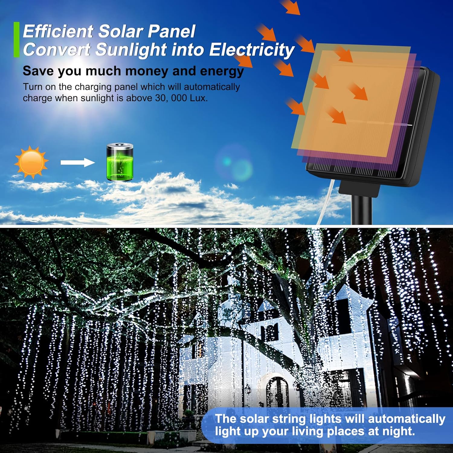 - 【Highly Efficient-powered Panel】Brightever outdoor fairy lights are equipped with 4 durable panels which can convert sunlight directly into electricity. That is to say, these led string lights use renewable energy, effectively saving the environment and dramatically reducing your electricity bills. You can use these fairy string lights anywhere, any time. They can give off impressive lighting effects for 10 hours if fully charged at daytime