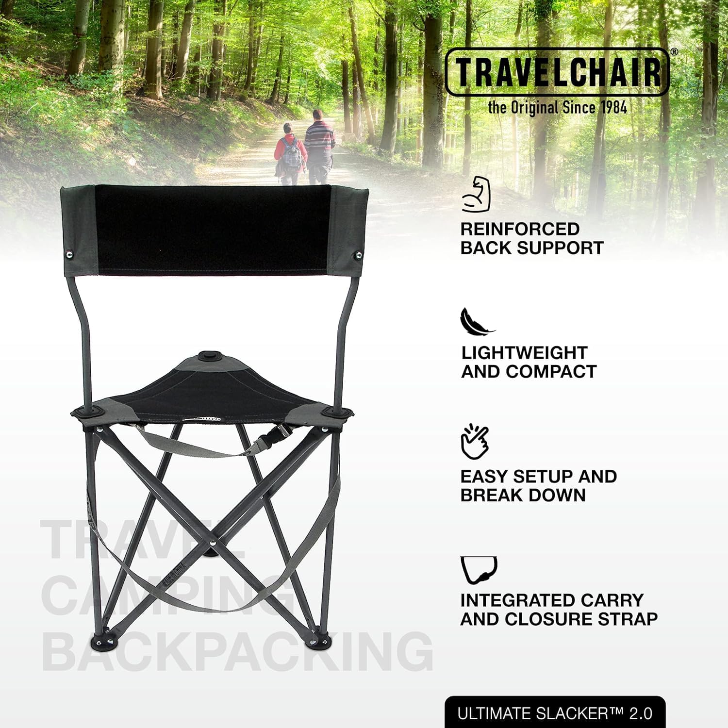 Travel Chair Ultimate Slacker, Quick Folding Tripod Stool with Backrest, Fishing Camping Hiking Chair with Carry Strap, Polyester, Black