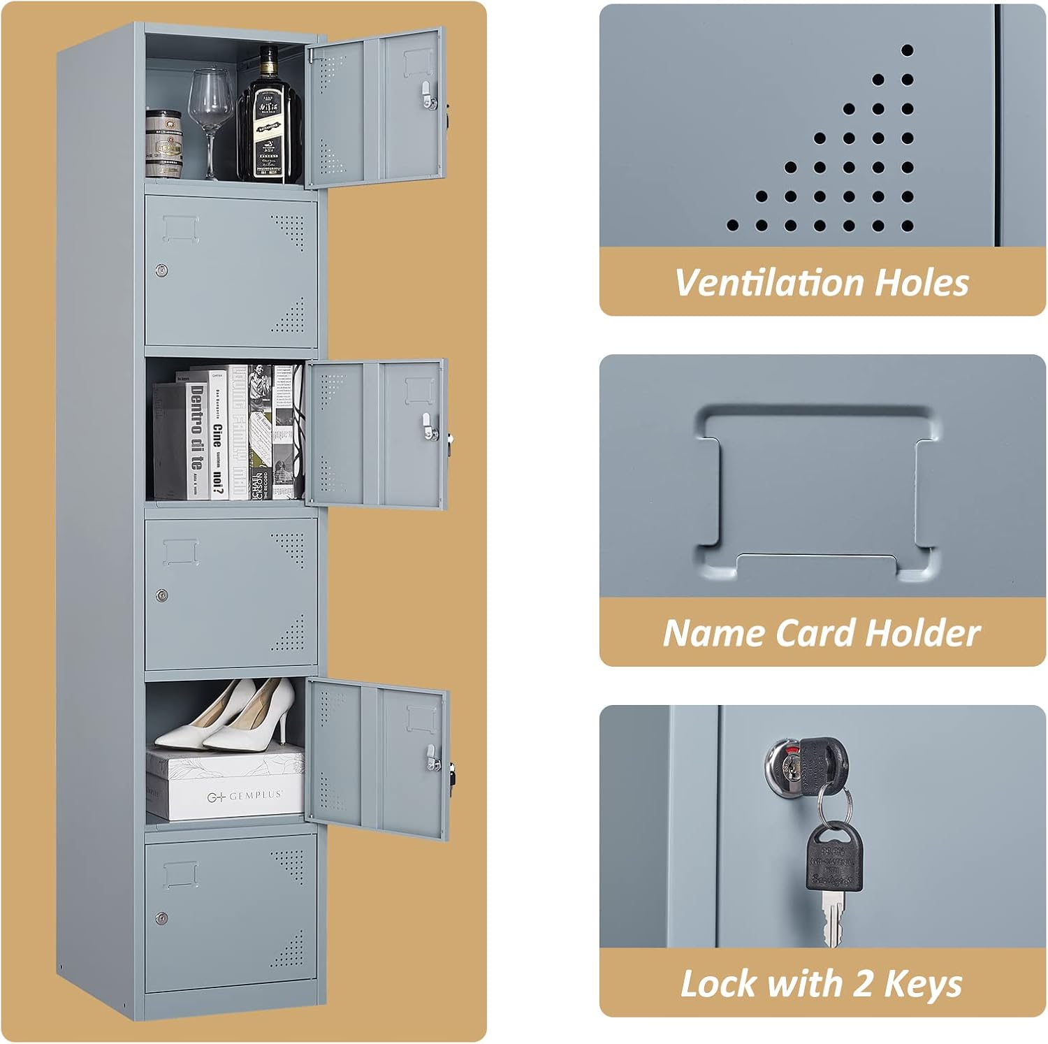 SISESOL Metal Locker Storage Cabinet with Doors and Shelves Metal Lockers with 6 Doors,71" Lockable Small Locker Storage Cabinet for Employees,School, Office, Home, Gym (Gray)