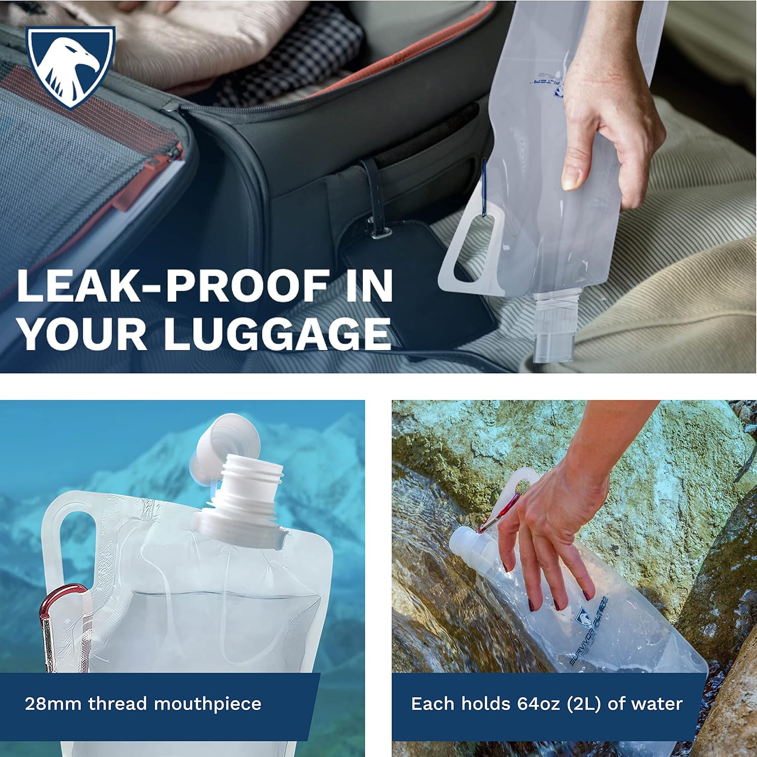 - Collapsible Water Bottle - Ideal collapsible water bottles for traveling. Each leak proof canteen can attach to any portable water filter with a 28 mm thread and holds 66oz (2L) of water.