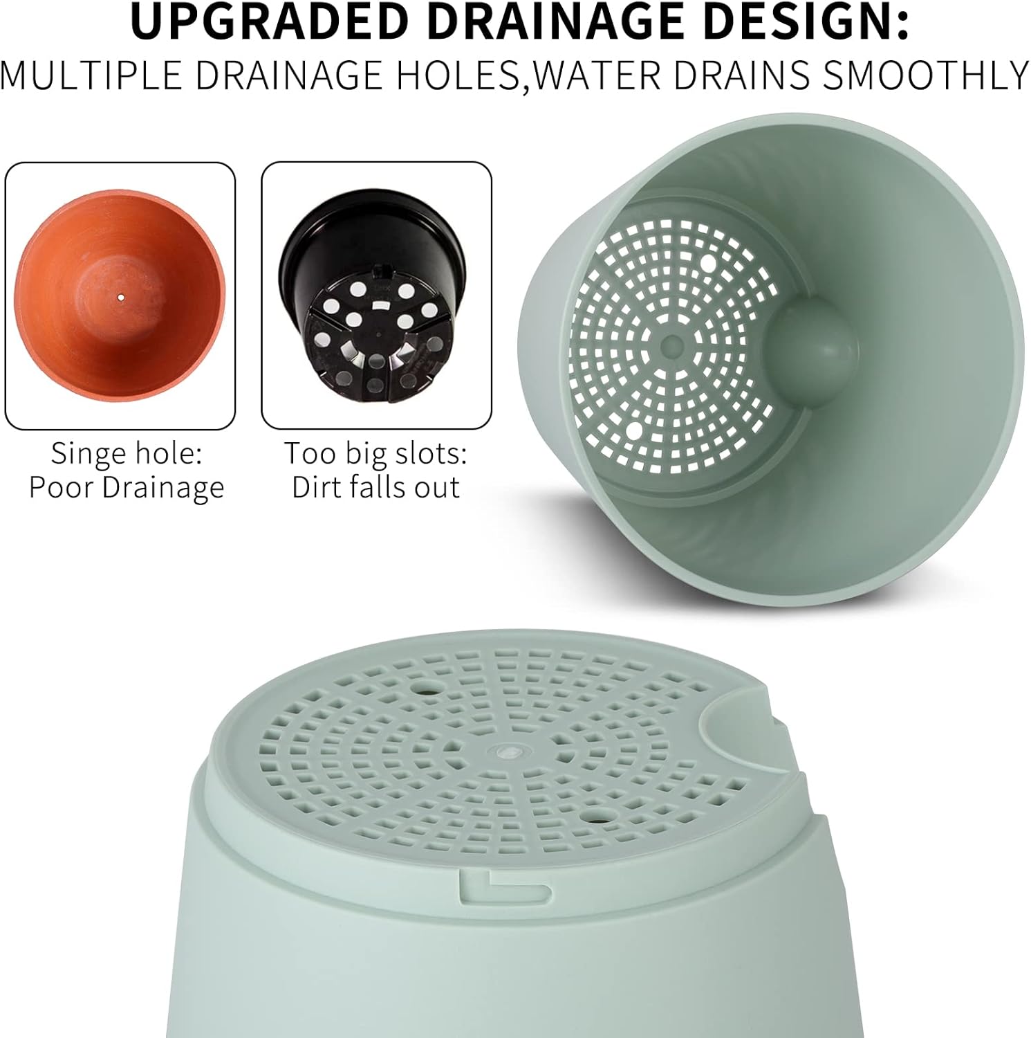 - 【Excellent Drainage Holes and Watering Lip】These flower pots for plants come with multiple drainage holes in the bottom. The holes and watering lip provide an air circulation system for the plant roots, which greatly reduces the problem of root rot of plants in a closed environment. The independent watering lip replenishes water for plants, so that water does not have to pass through the plant itself, At the same time, it is convenient to observe the current water level.