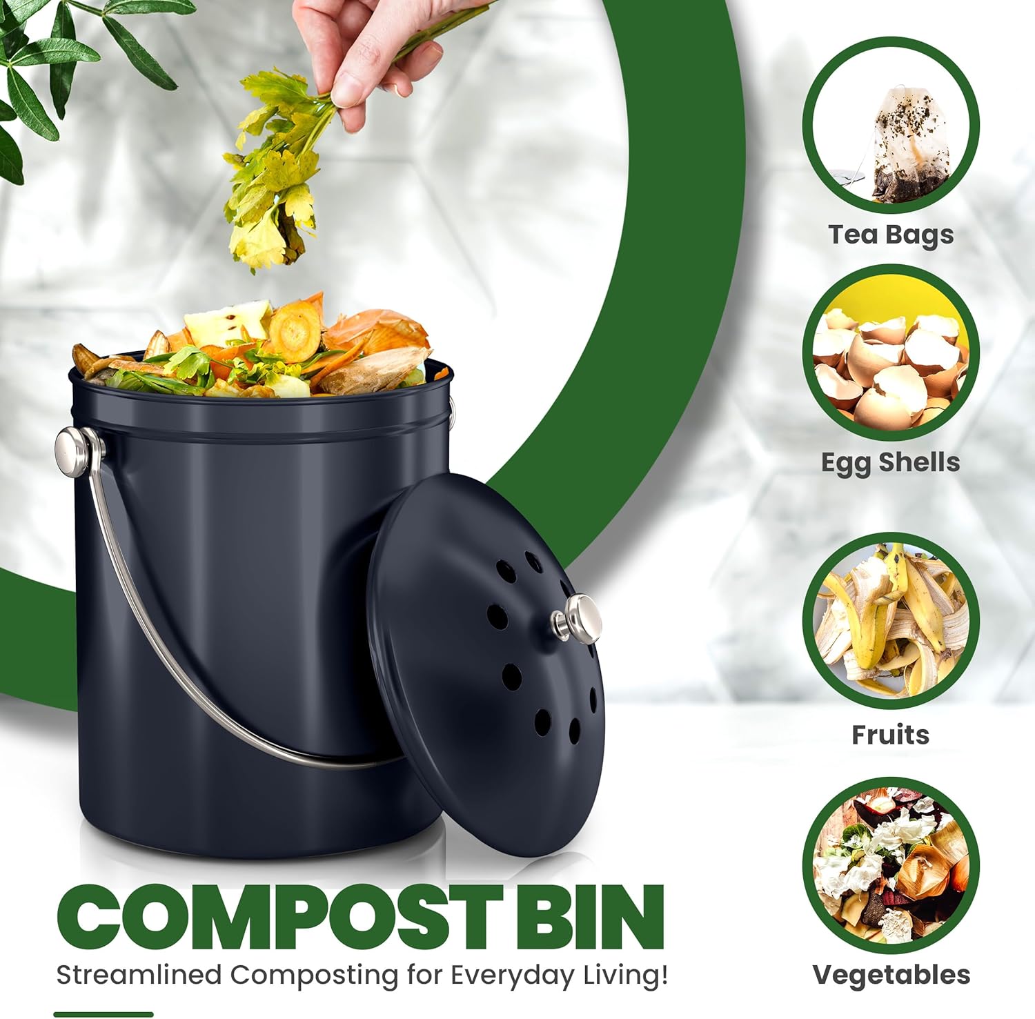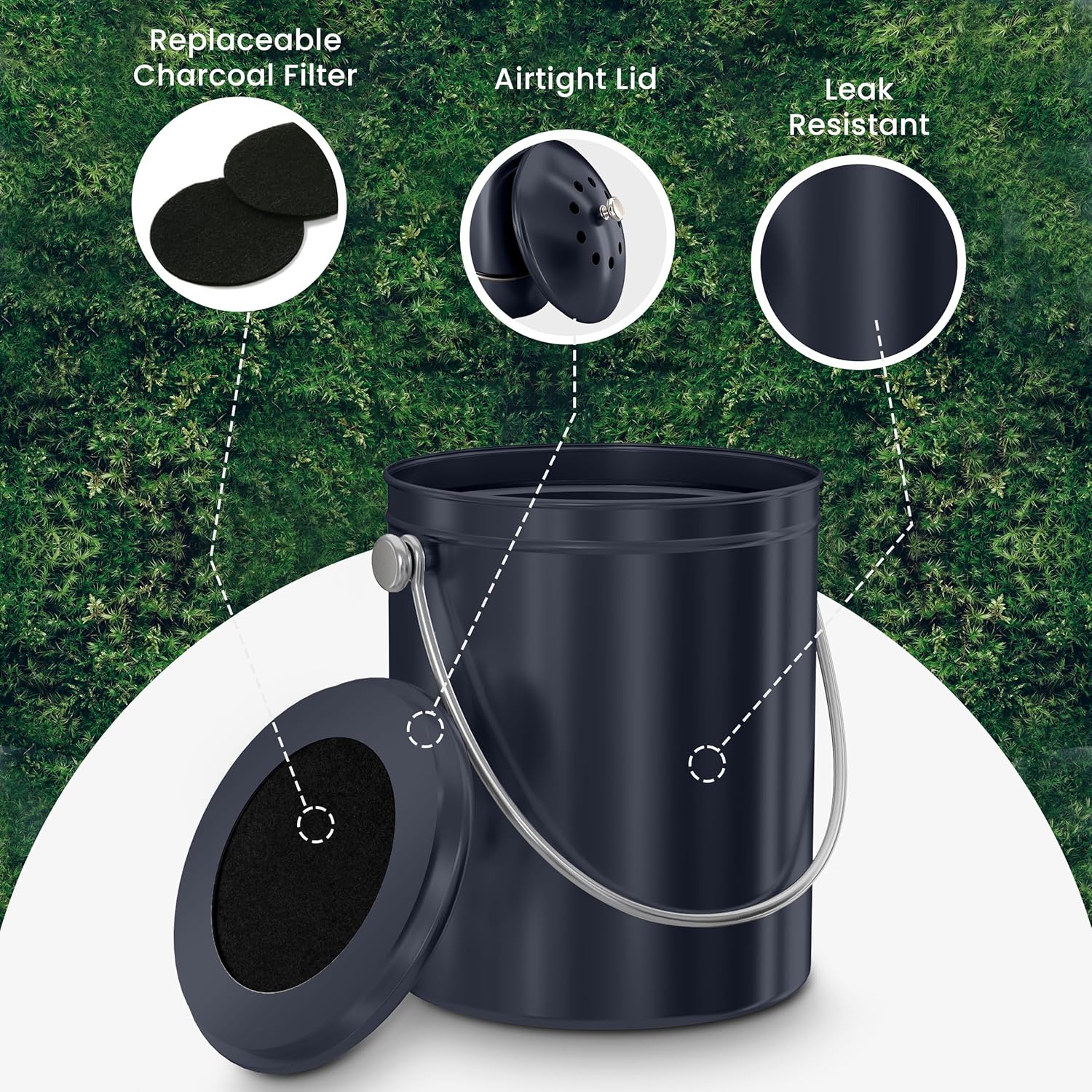 - Sturdy, stylish and sleek design complements any decor so that this kitchen compost bin can sit conveniently on your counter-top or wherever you need it