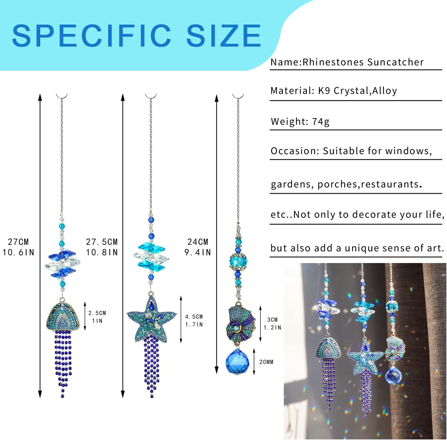 - What You Will Get: The set of sun catcher with crystals come with 1 pcs rhinestone starfish pendant,1 pcs rhinestone conch pendant,1 pcs rhinestone jellyfish pendant with crystal beads prisms for window hanging delicate sun catchers with crystals,you can freely mix and match into your bedroom,living room,balcony. You can enjoys the rainbow energy in anywhere your home when the sun raised