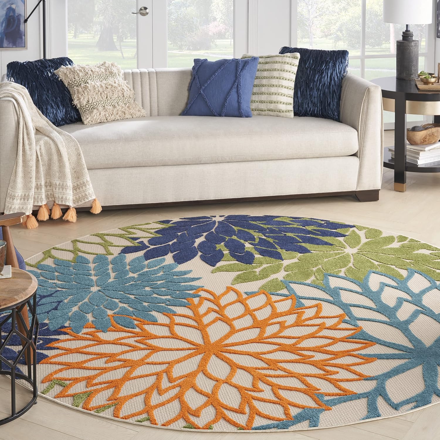 - Floral indoor/outdoor rug brings a cool tropical vibe to your home