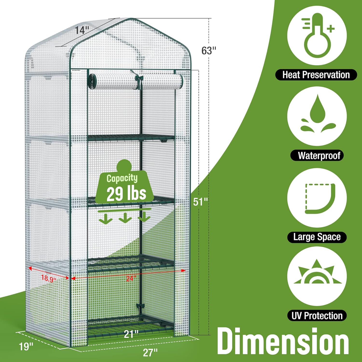 - 4-Tier Mini Greenhouse for Outdoor & Indoor Use: This mini greenhouse is perfect for both indoor and outdoor gardening. With 4 sturdy tiers (27”L x 19”W), each shelf holds up to 29 lbs, offering plenty of room for pots,trays,and seedling flats.A must-have for plant lovers seeking sturdy vertical space for growing herbs,flowers, or seedlings