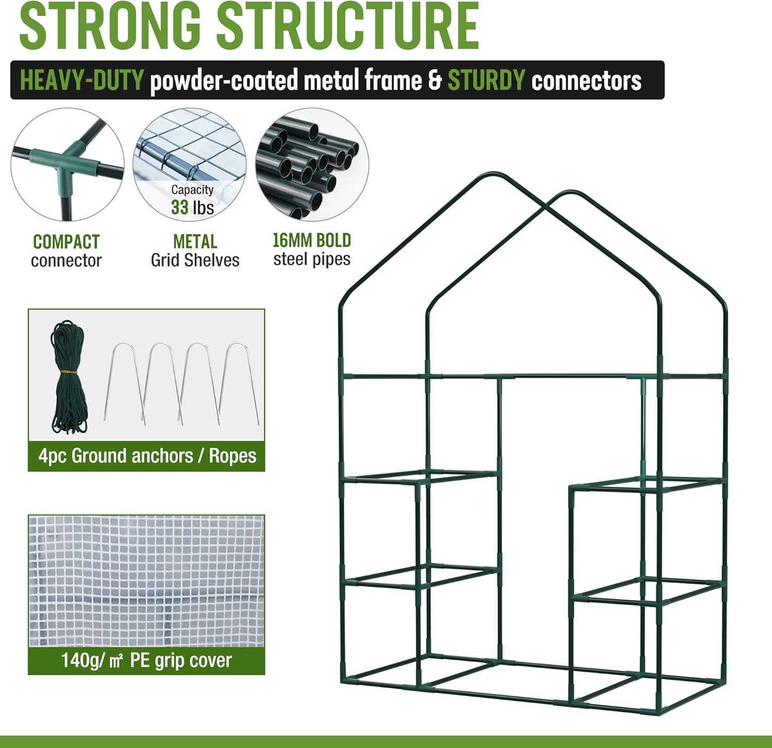 - Strong Structure: Green houses for outside heavy duty built with heavy-duty powder-coated metal frame and reinforced thick (140g/γ‘) water-proof PE cover. Two bearing shelves on each side are enough to hold more seed trays, pots, and plants. There are straps at the four corners to attach to the frame to enhance stability. Additionally, the reinforced PE cover of the greenhouse cabinet is stronger and thicker than standard PVC to reinforce the frame while promoting healthy plant growth.