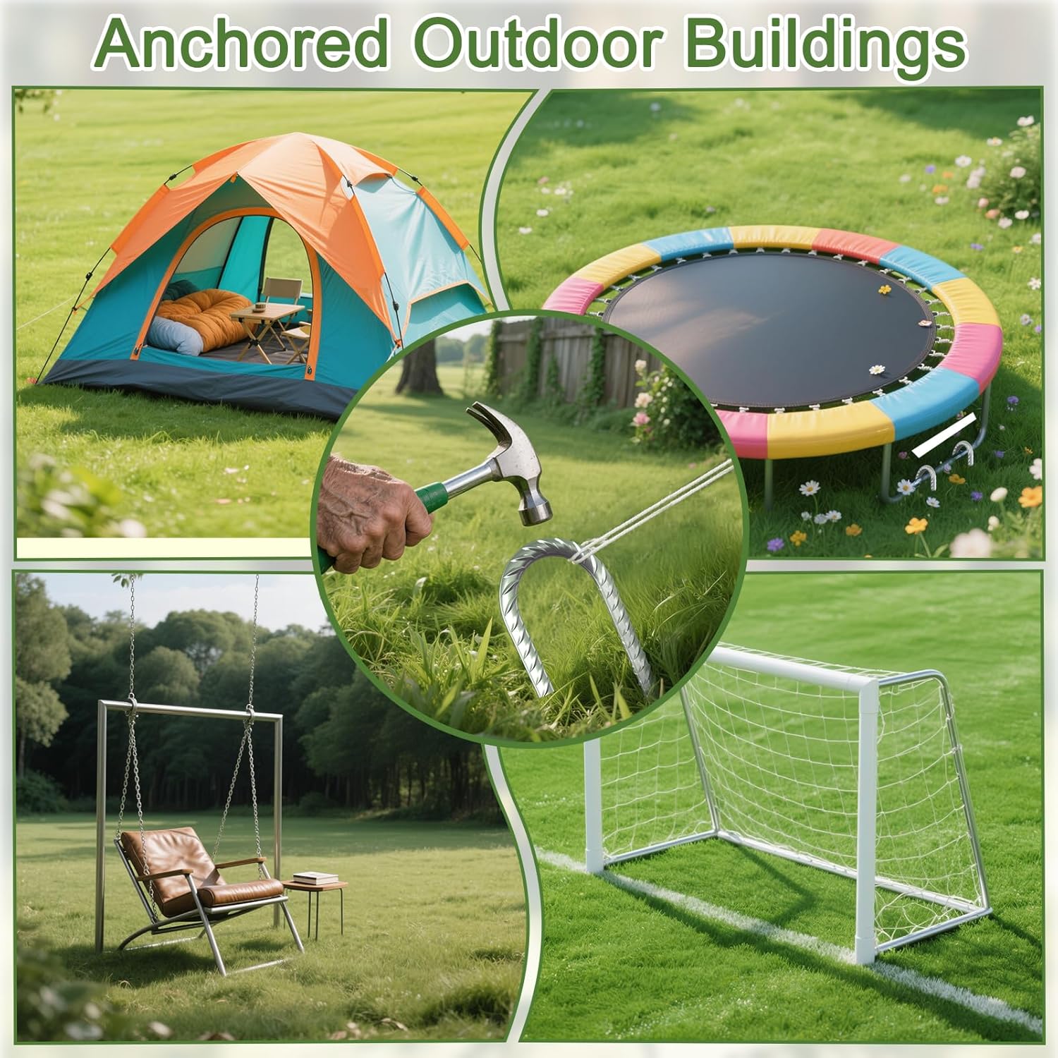 - WIDE APPLICATION: The main application scenarios of tent stakes heavy duty are garden farms, festival decoration, outdoor construction, and fence reinforcement. Such as fixed chicken coops, inflatable decorative Santa , green house, tents, trampolines, carports, swings , and the bottom of chain fences to prevent pets from running out or wild animals from entering