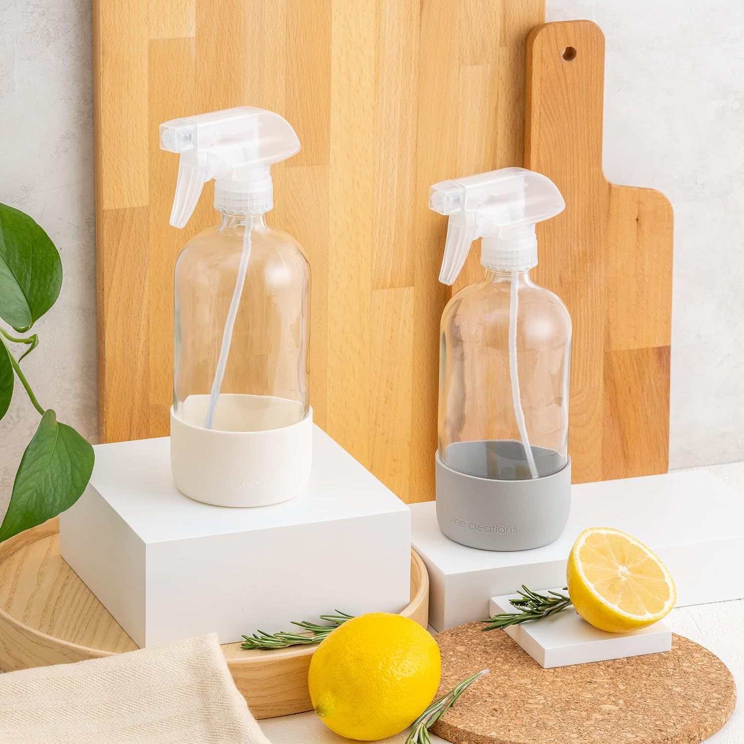 Vine Creations Glass Spray Bottles for Cleaning Solutions, Clear Glass Spray Bottle with Silicone Sleeve, 16 oz Empty Spray Bottles for Cleaning, Plant Spray Bottle, Mist and Stream Nozzle - 2 Pack